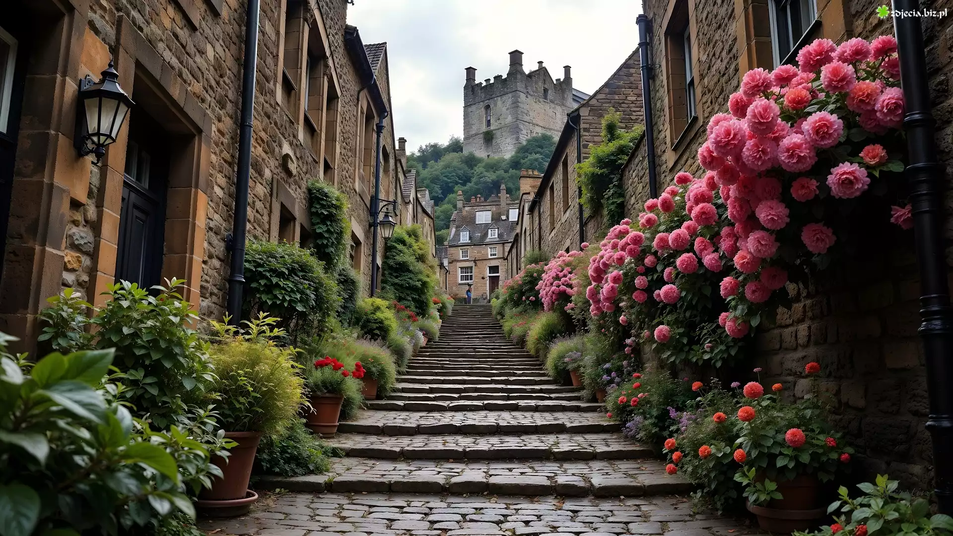 Zdjęcie Domy, Uliczka, Brukowana, Schody, Kwiaty, AI