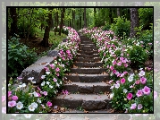 Zdjęcie, Schody, Kwiaty, Drzewa