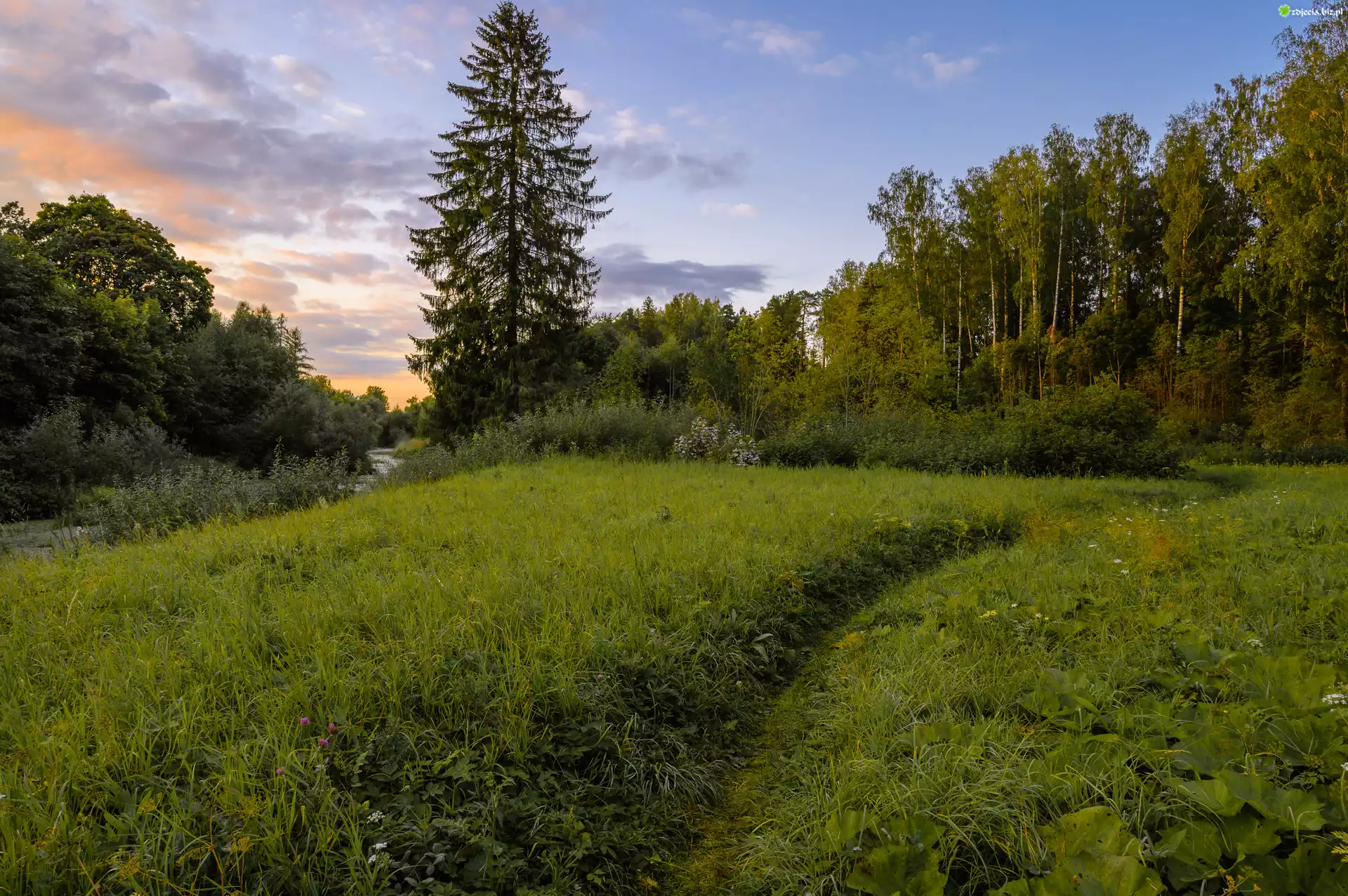 Zdjęcie Polana, Trawa, Drzewa, Ścieżka, Zieleń, Chmury, Lato