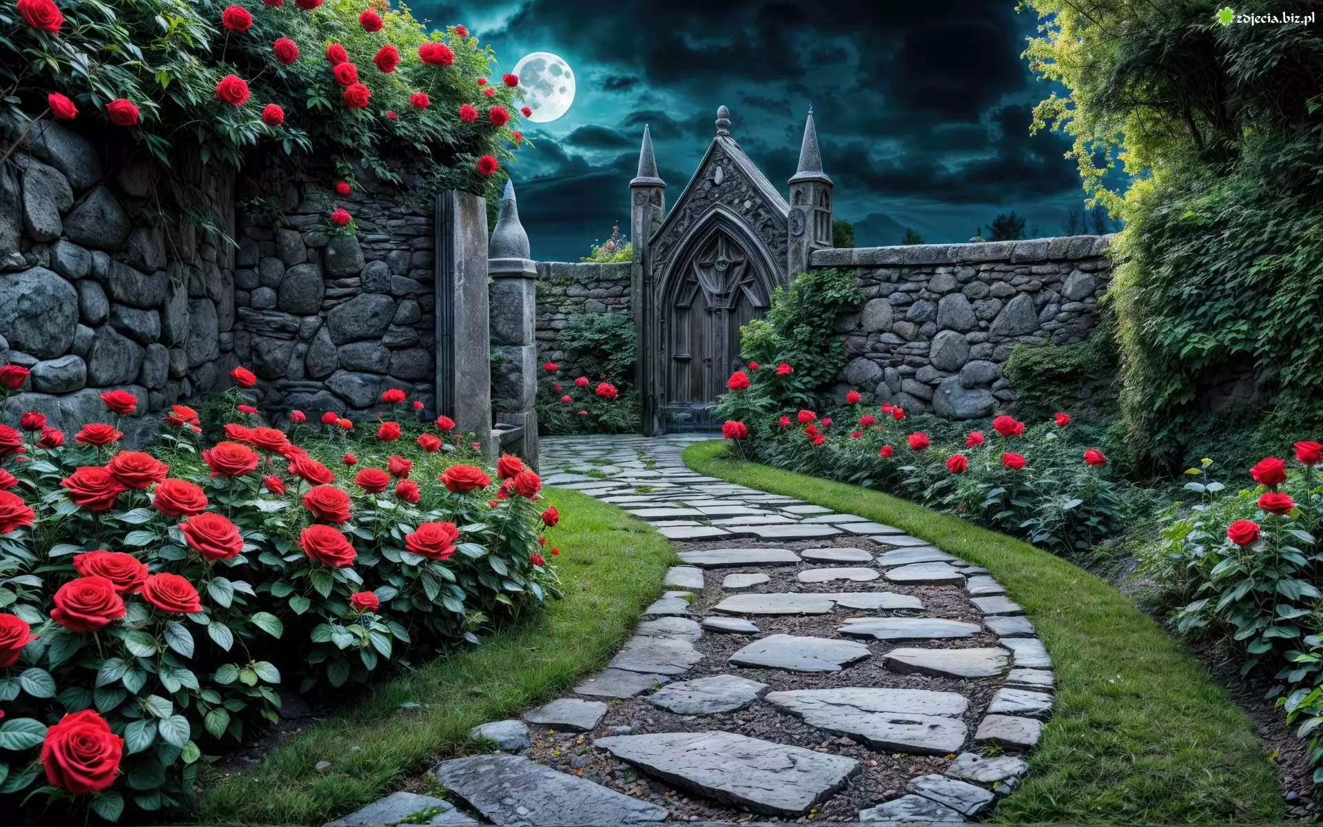 Zdjęcie Róże, Ścieżka, Mur, Księżyc, Grafika