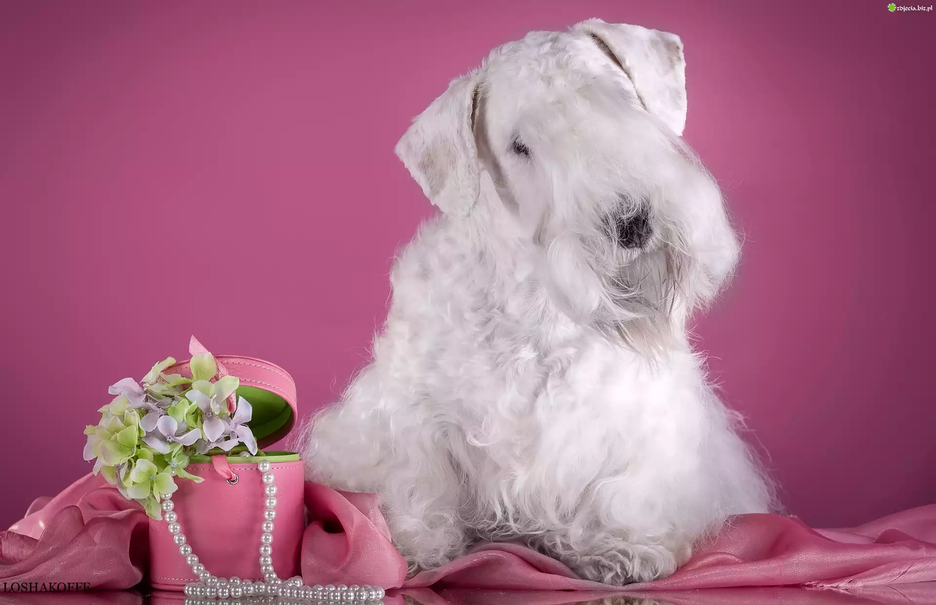 biały, Sealyham Terrier Mały, Biały, Szczeniaczek, Pies, Sealyham Terrier Sealyham Terrier, Pudełko, Kwiatki, Perły