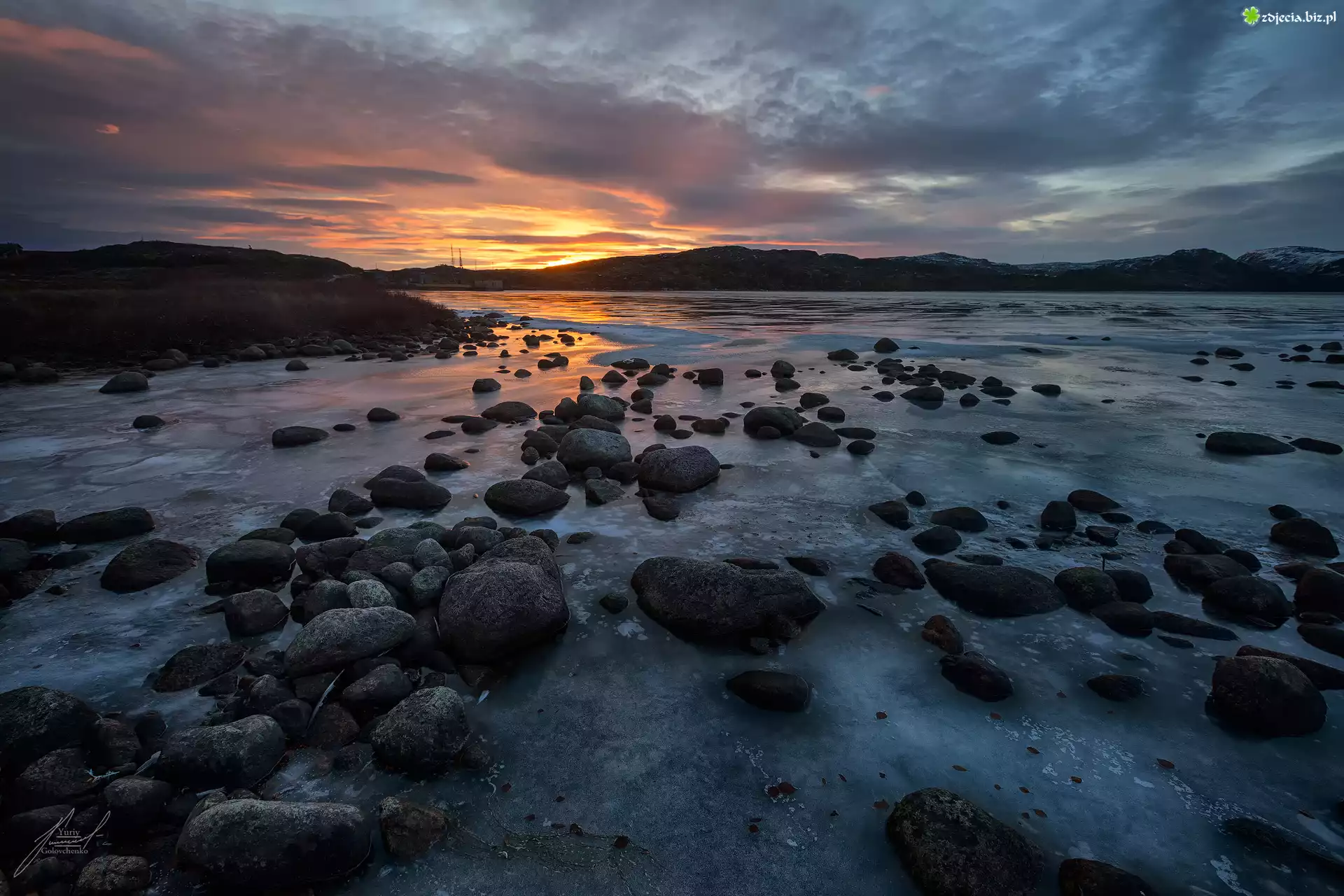 Zdjęcie Teriberka, Jezioro Sekretarskoye, Kamienie, Lód, Chmury, Zachód słońca, Obwód murmański, Rosja |
