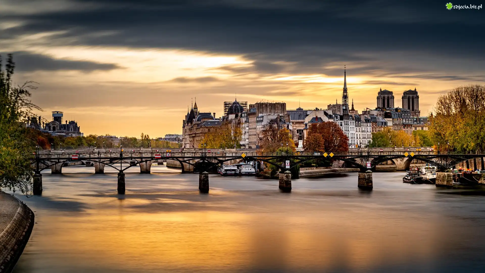 Zdjęcie Rzeka Sekwana, Most, Domy, Drzewa, Chmury, Paryż, Francja