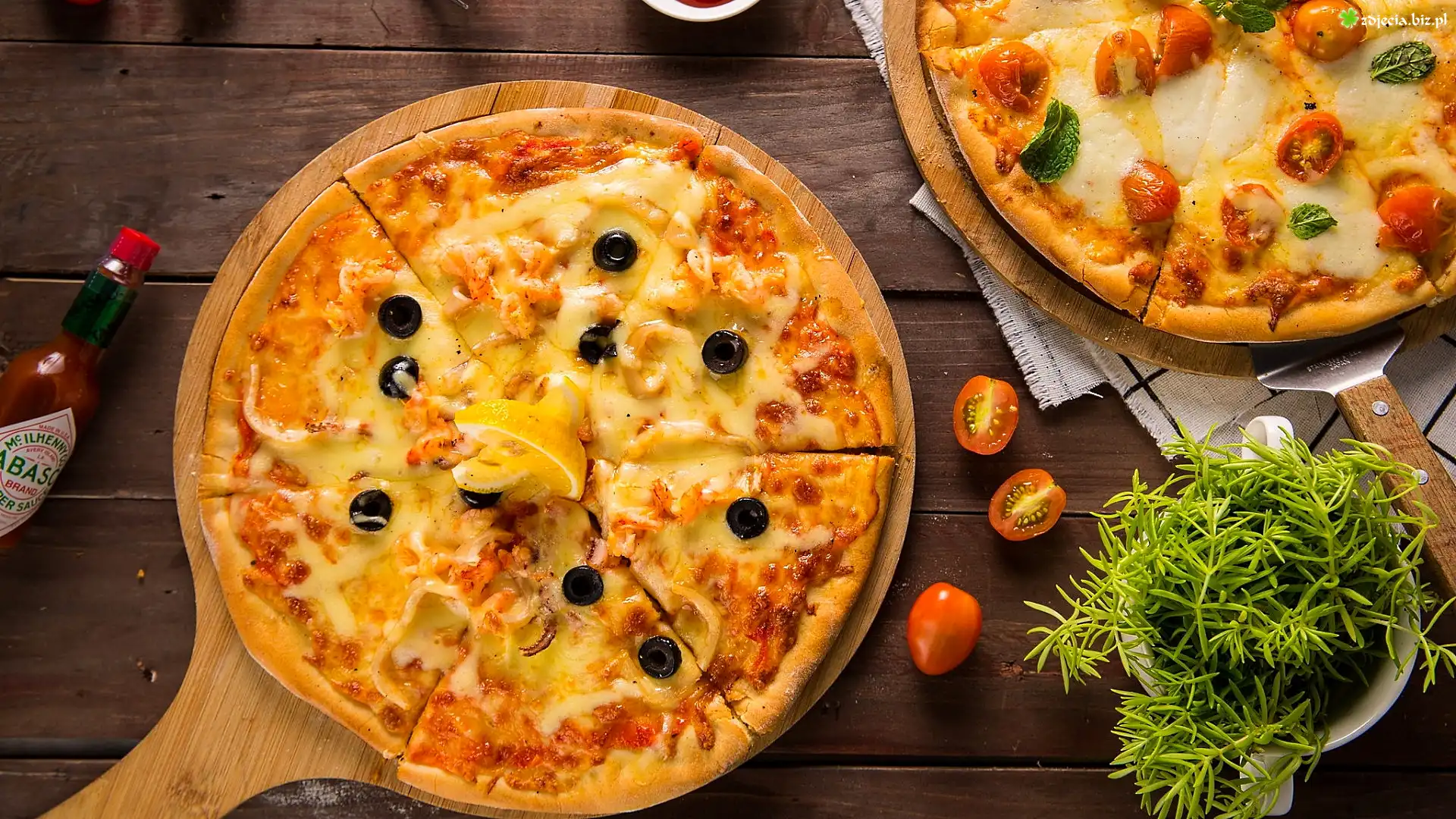 Zdjęcie Pizza, Ser, Oliwki, Pomidorki, Sos, Tabasco, Zioła, Deski