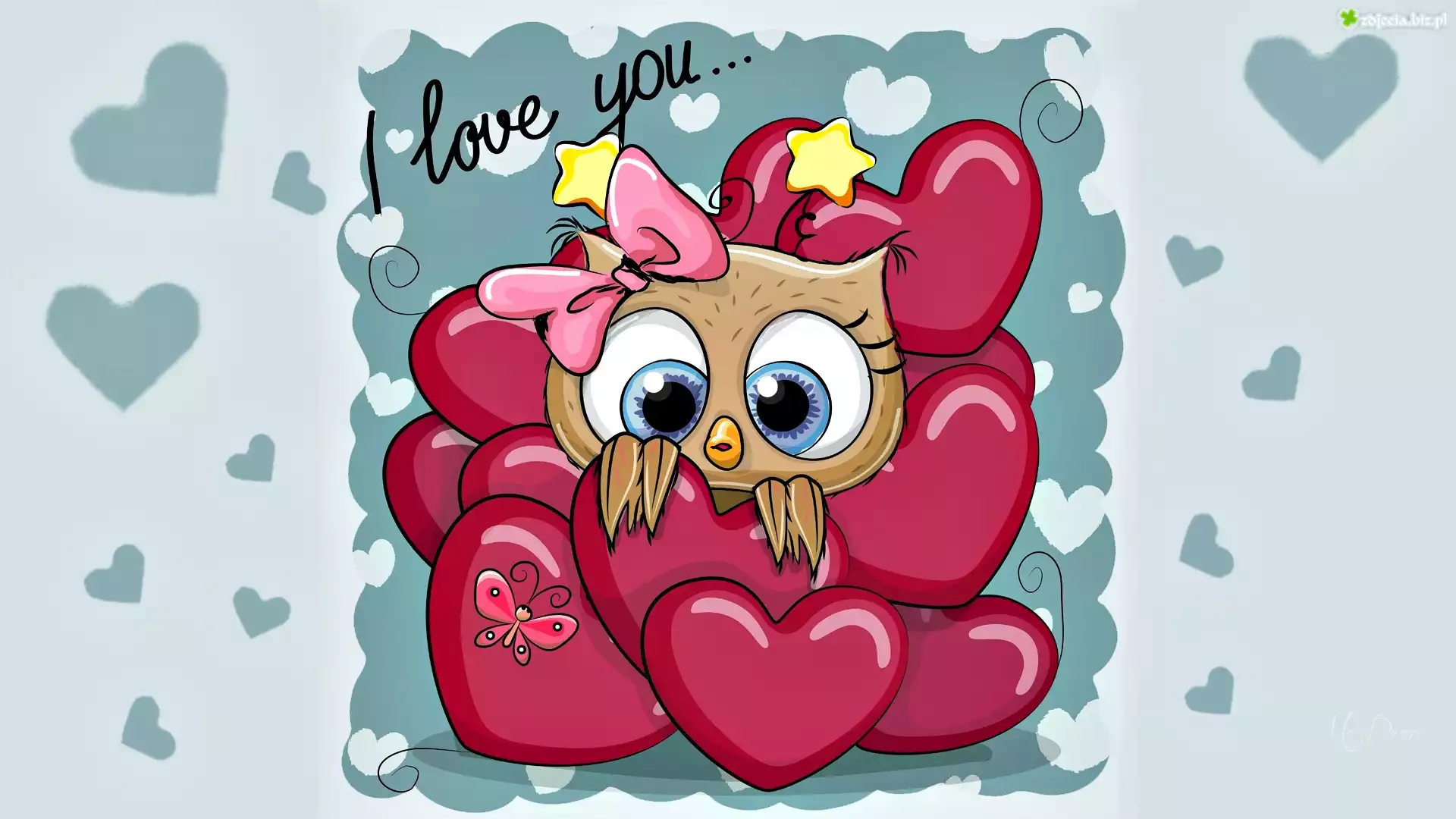 Zdjęcie Sówka, Serca, Napis, I love you, Grafika 2D