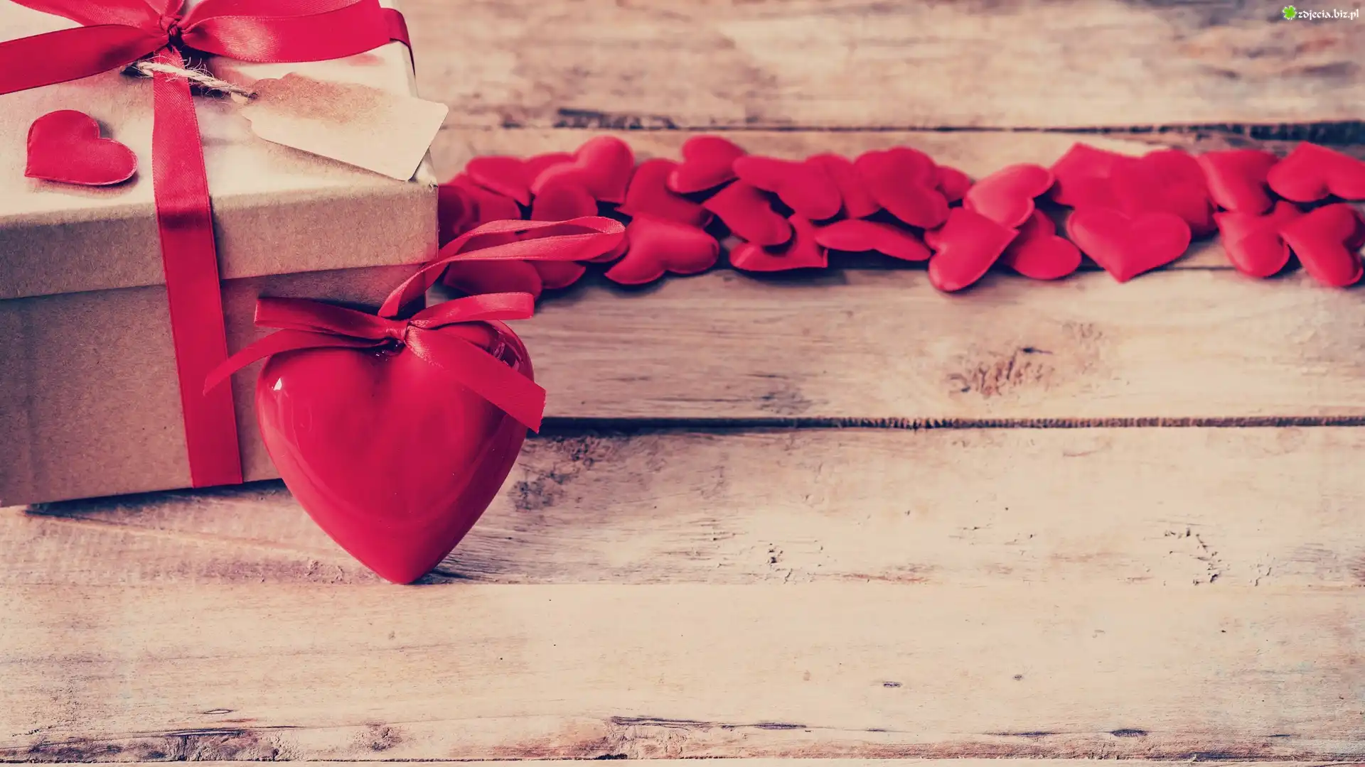 Zdjęcie Serce, Wstążka, Pudełko, Prezent, Deski