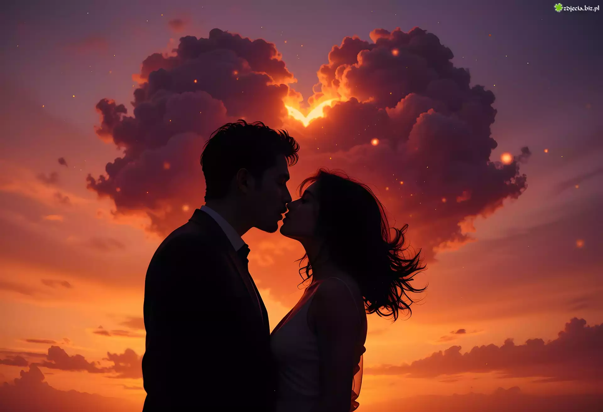 Zdjęcie Zakochani, Pocałunek, Chmury, Serce, Zachód słońca