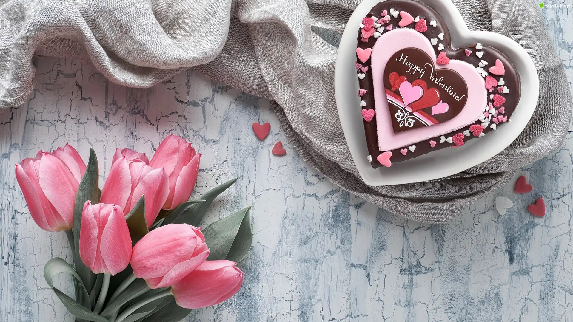 Zdjęcie Czekoladowe, Serce, Torcik, Szary, Materiał, Różowe, Tulipany, Walentynki