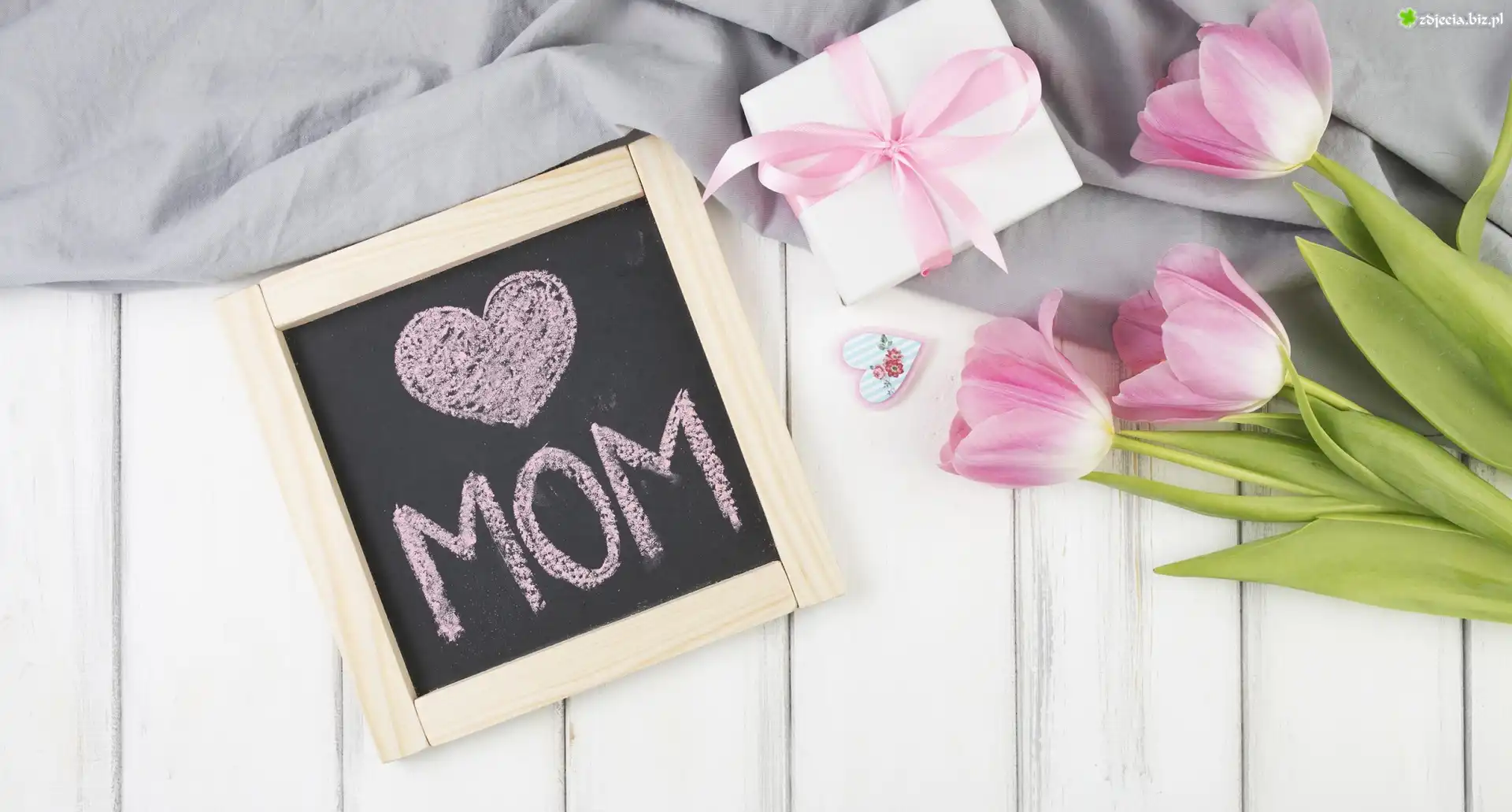 Zdjęcie Dzień Matki, Prezent, Bukiet, Różowe, Tulipany, Tablica, Napis, Serduszka