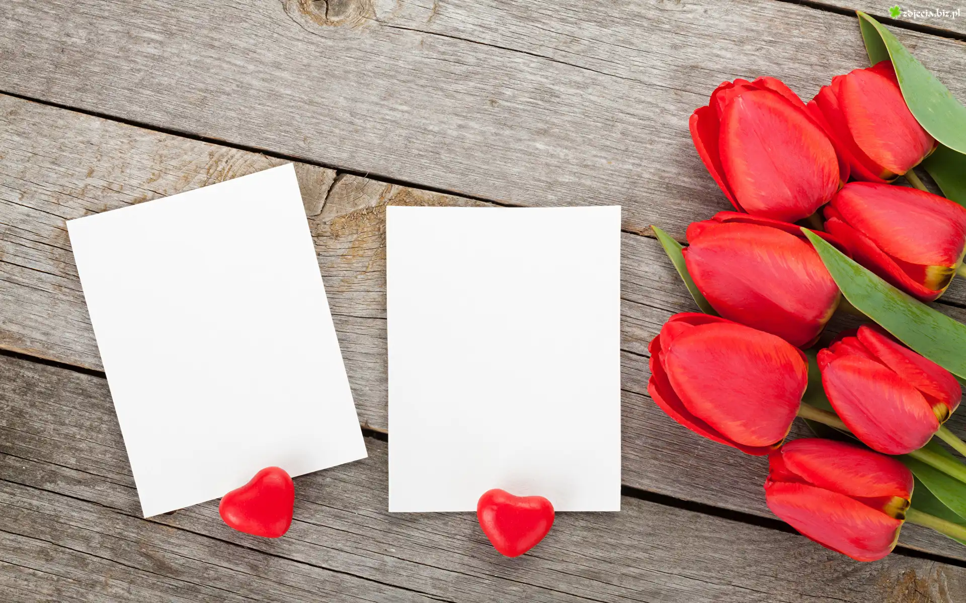 Zdjęcie, Walentynki, Serduszka, Kwiaty, Czerwone, Tulipany, Kartki, Deski