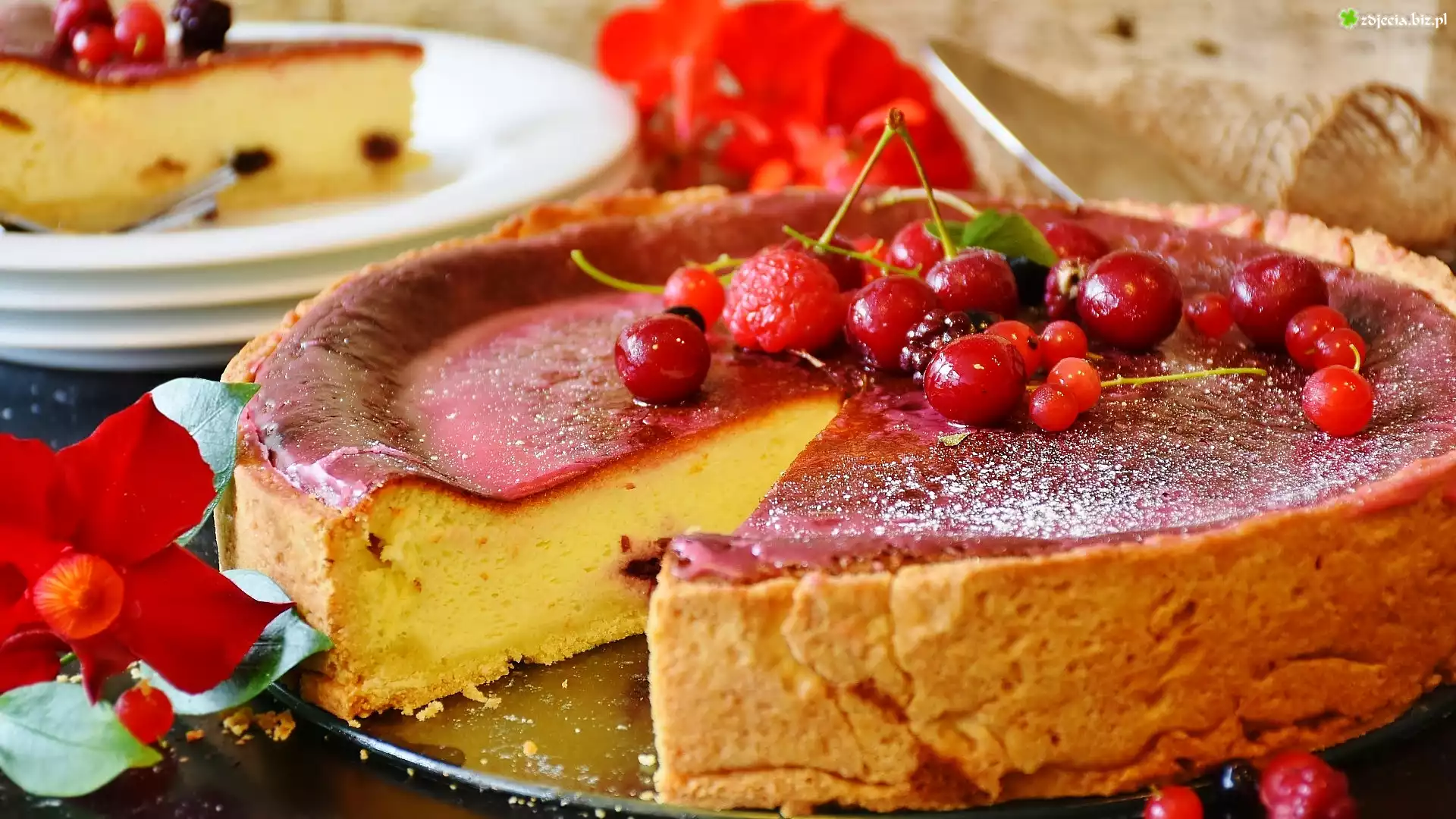 Zdjęcie Ciasto, Sernik, Maliny, Wiśnie, Porzeczki, Czerwony kwiat