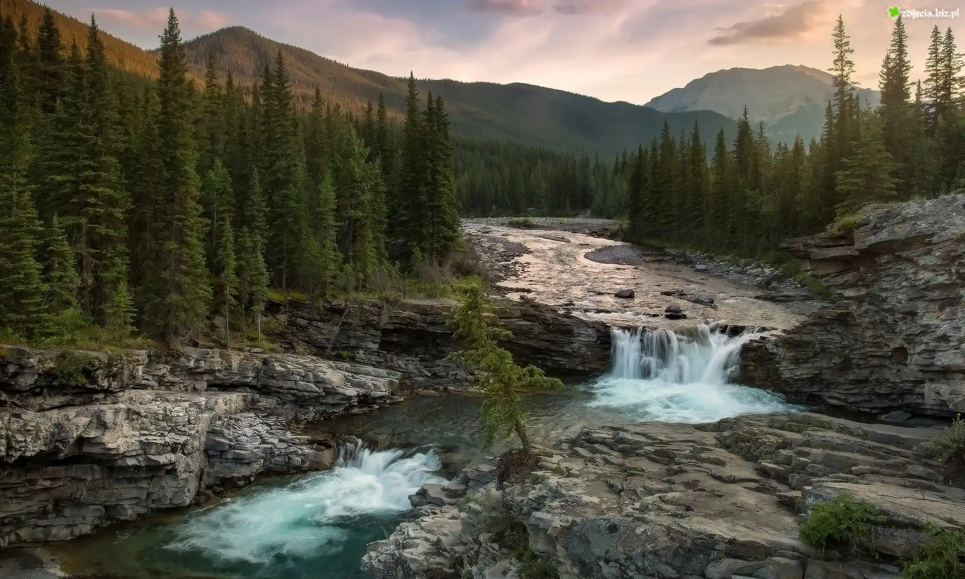 Zdjęcie Góry Skaliste, Skały, Drzewa, Rzeka Sheep, Wodospad Sheep River, Prowincja Alberta, Kanada