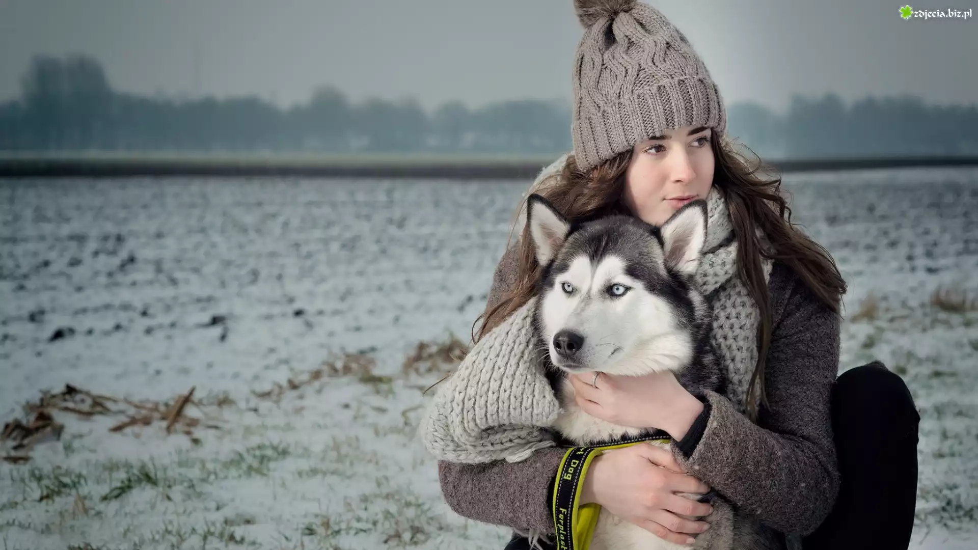 Zdjęcie Pies, Siberian husky, Czapka, Pole, Dziewczyna, Szalik