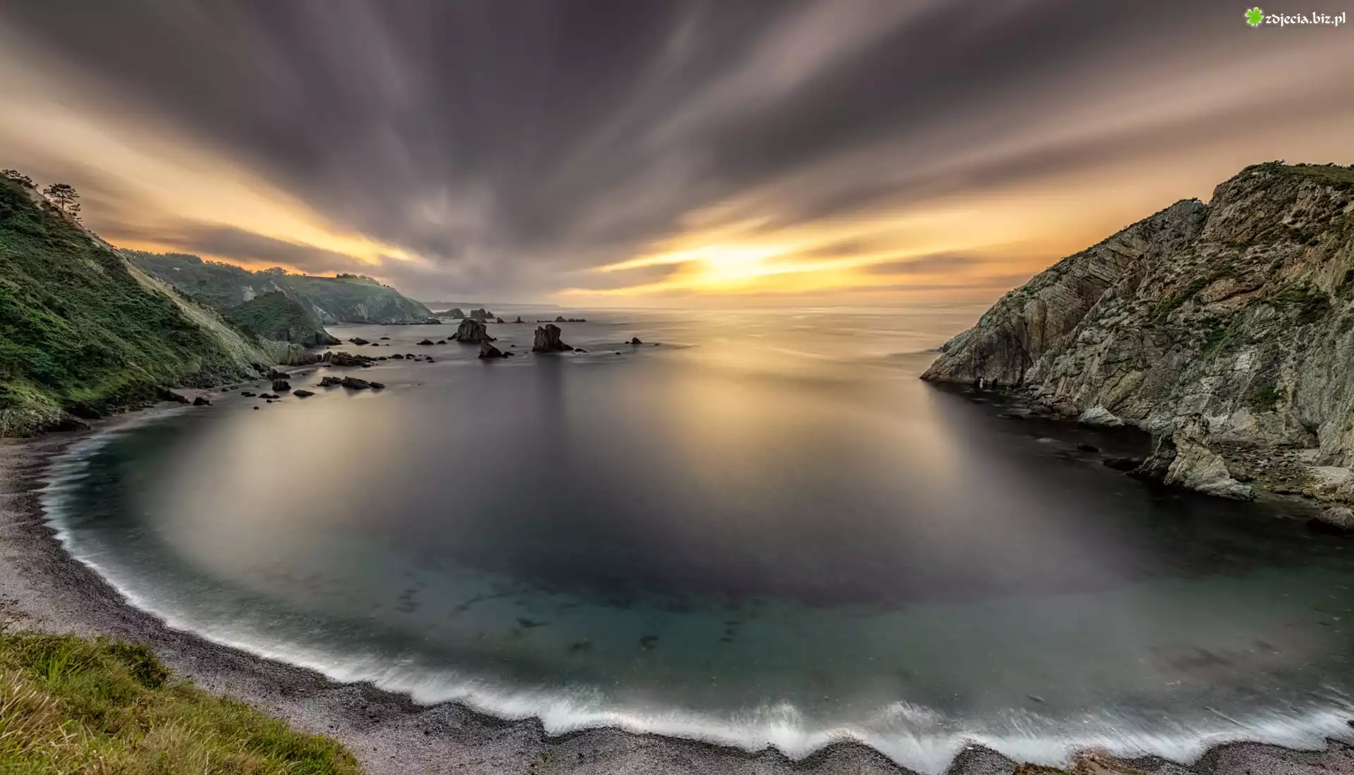 Zdjęcie Morze, Zatoka, Zachód słońca, Skały, Wybrzeże, Plaża, Playa del Silencio, Asturia, Hiszpania |
