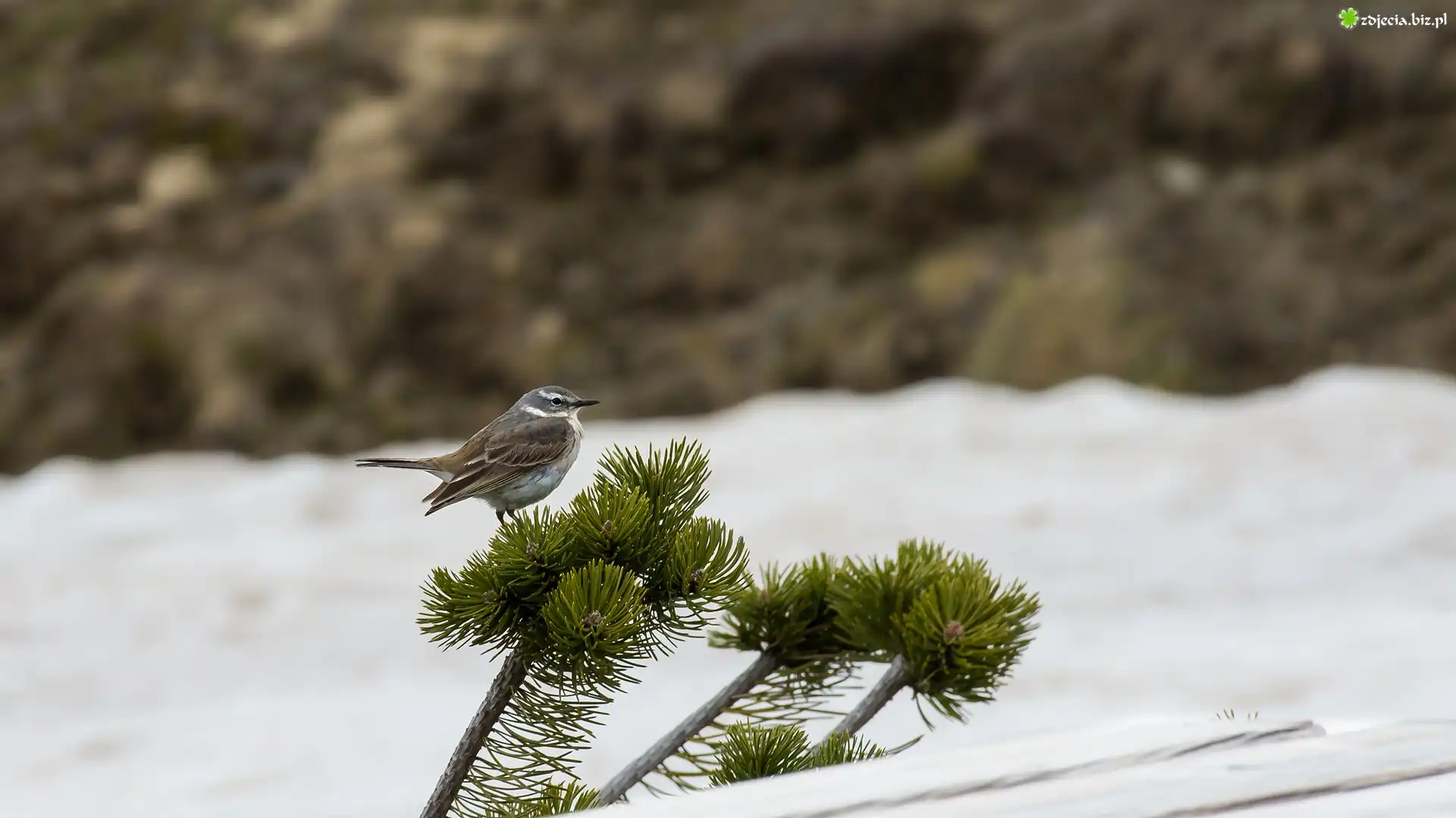 Zdjęcie, Ptak, Siwerniak, Świergotek górski, Gałązki, Sosna, Rozmyte, Tło