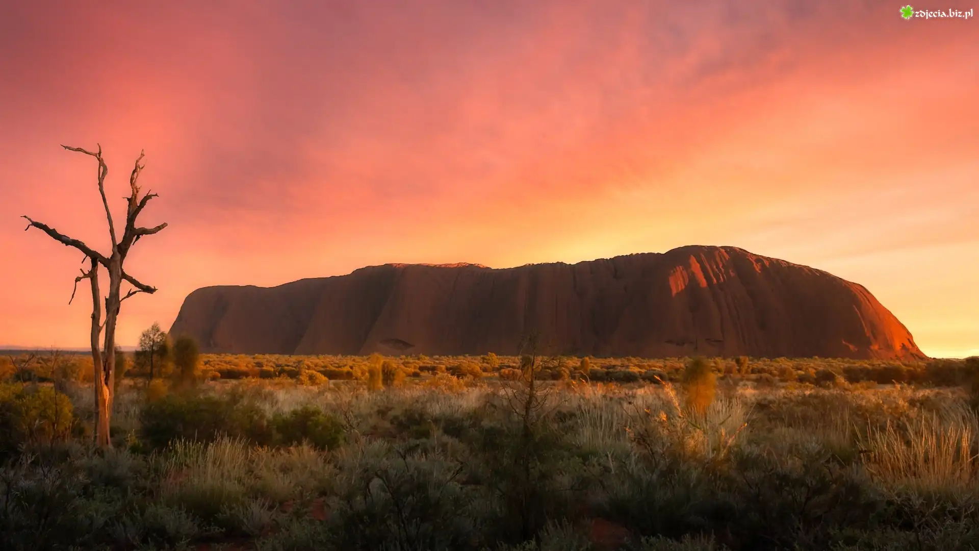 Zdjęcie Australia, Wschód słońca, Góra, Skała, Ayers Rock, Uluru, Park Narodowy Uluru Kata Tjuta, Trawa |