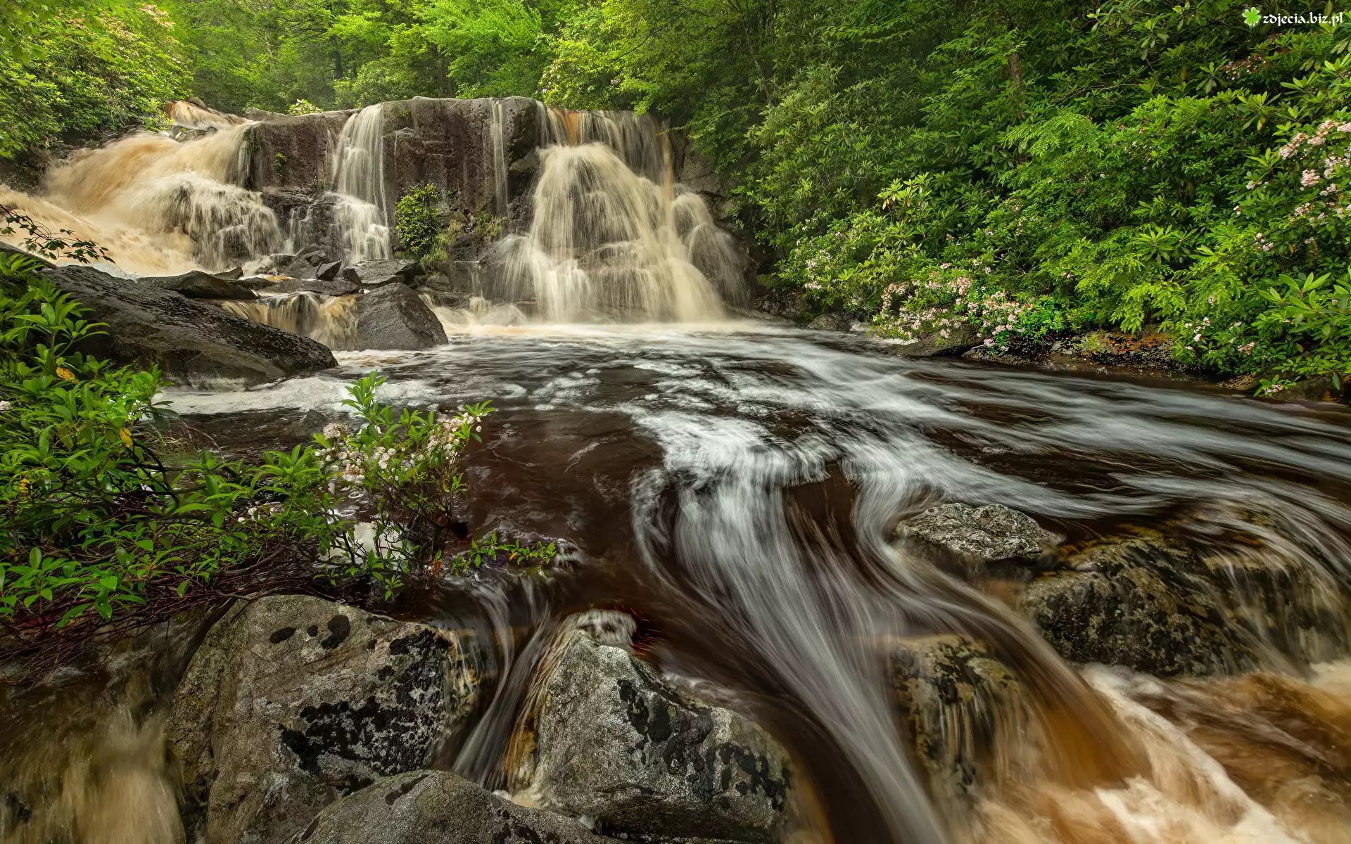 Zdjęcie Skała, Wodospad, Kamienie, Rzeka, Drzewa, Krzewy