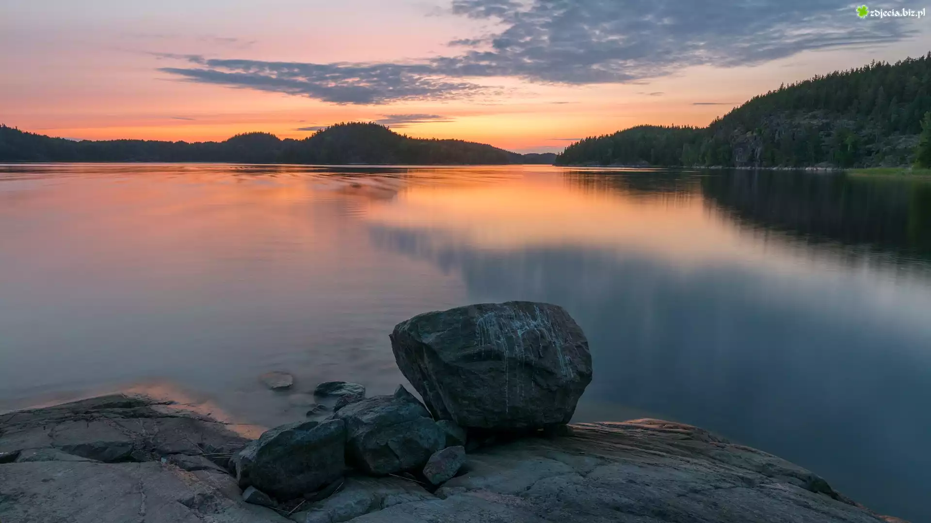 Zdjęcie Kamienie, Skała, Jezioro, Lasy, Niebo, Chmury, Zachód słońca