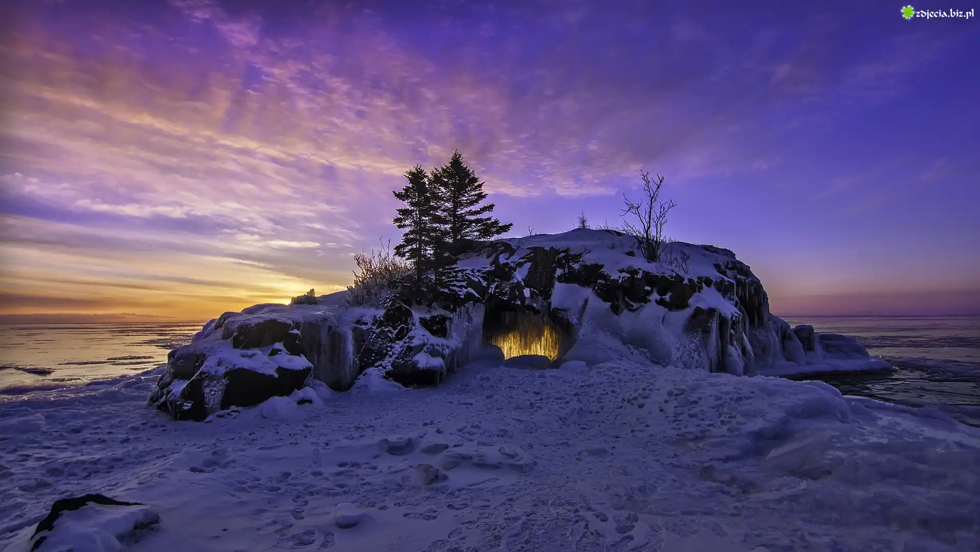 Zdjęcie Wybrzeże, Skała, Drzewa, Morze, Wschód, Słońca, Zima