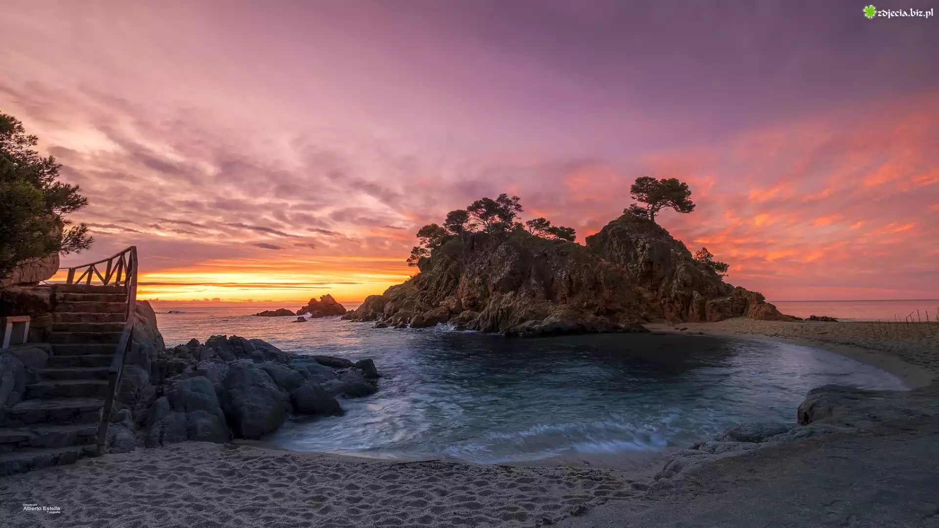Zdjęcie Zachód słońca, Plaża, Schody, Morze, Skała, Drzewa, Playa de Aro, Katalonia, Hiszpania |