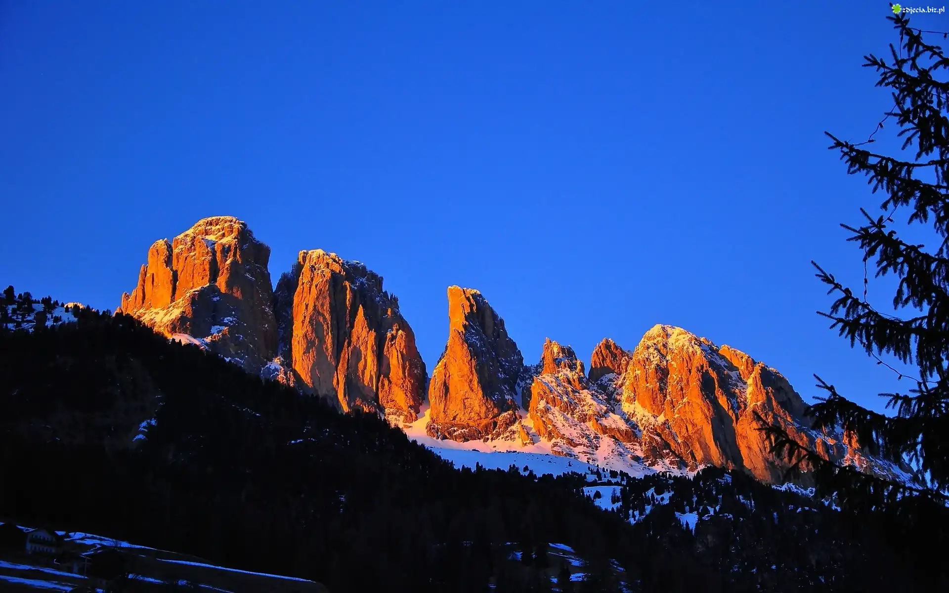 Zdjęcie, Skaliste, Góry, Lasy, Zachód, Słońca, Śnieg