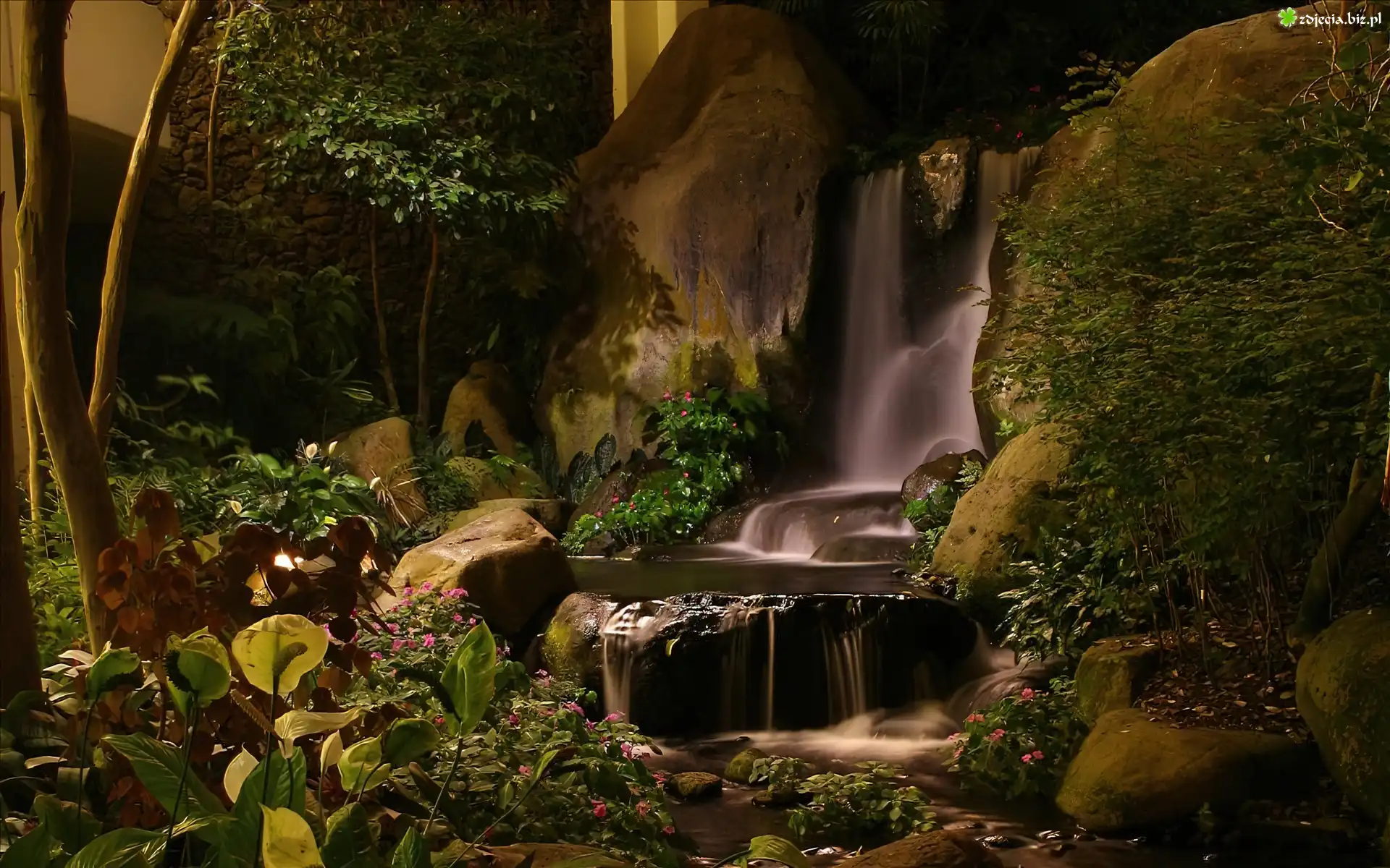Zdjęcie, Skalniak, Rośliny, Kwiatuszki, Kamienie, Wodospad