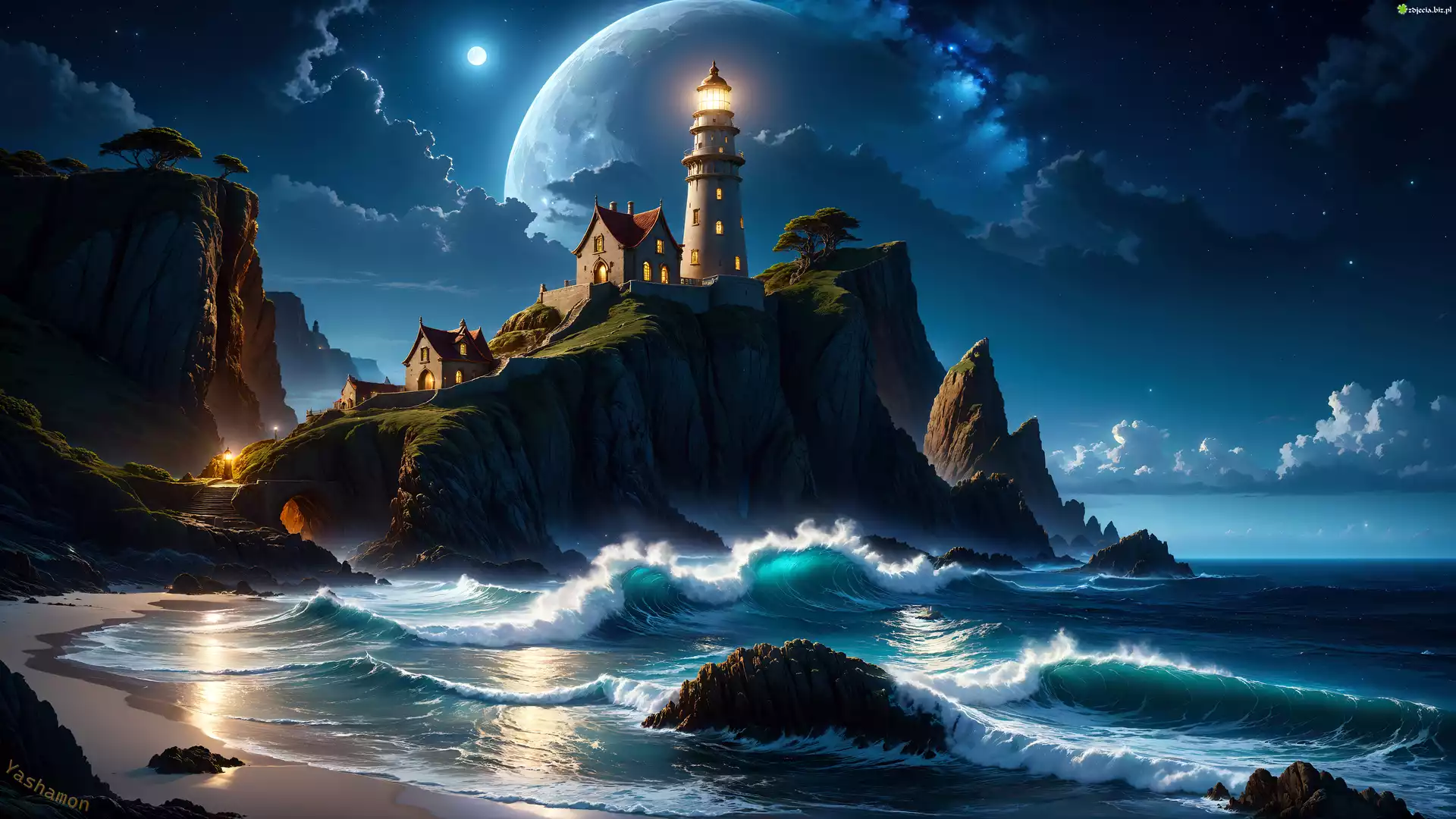 Zdjęcie, Oświetlona, Latarnia morska, Skały, Morze, 2D