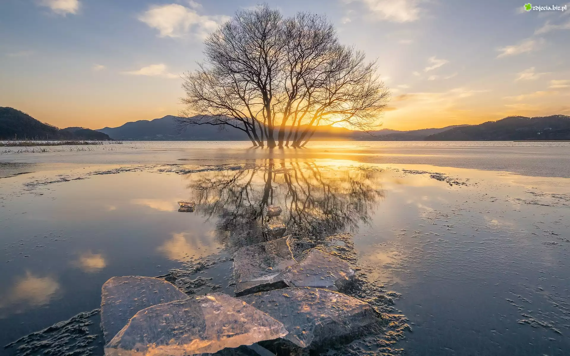 Zdjęcie Jezioro, Wzgórza, Drzewo, Skały, Słoneczne światło, Odbicie