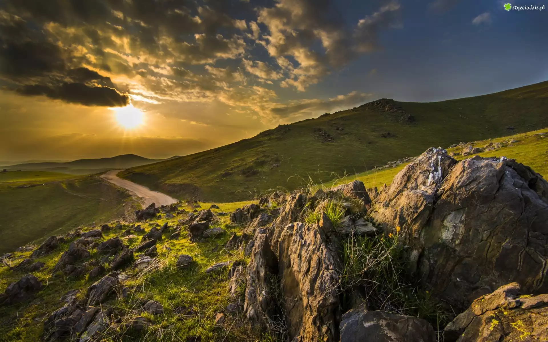 Zdjęcie Góry, Skały, Droga, Chmury, Promienie, Słońca, Jesień