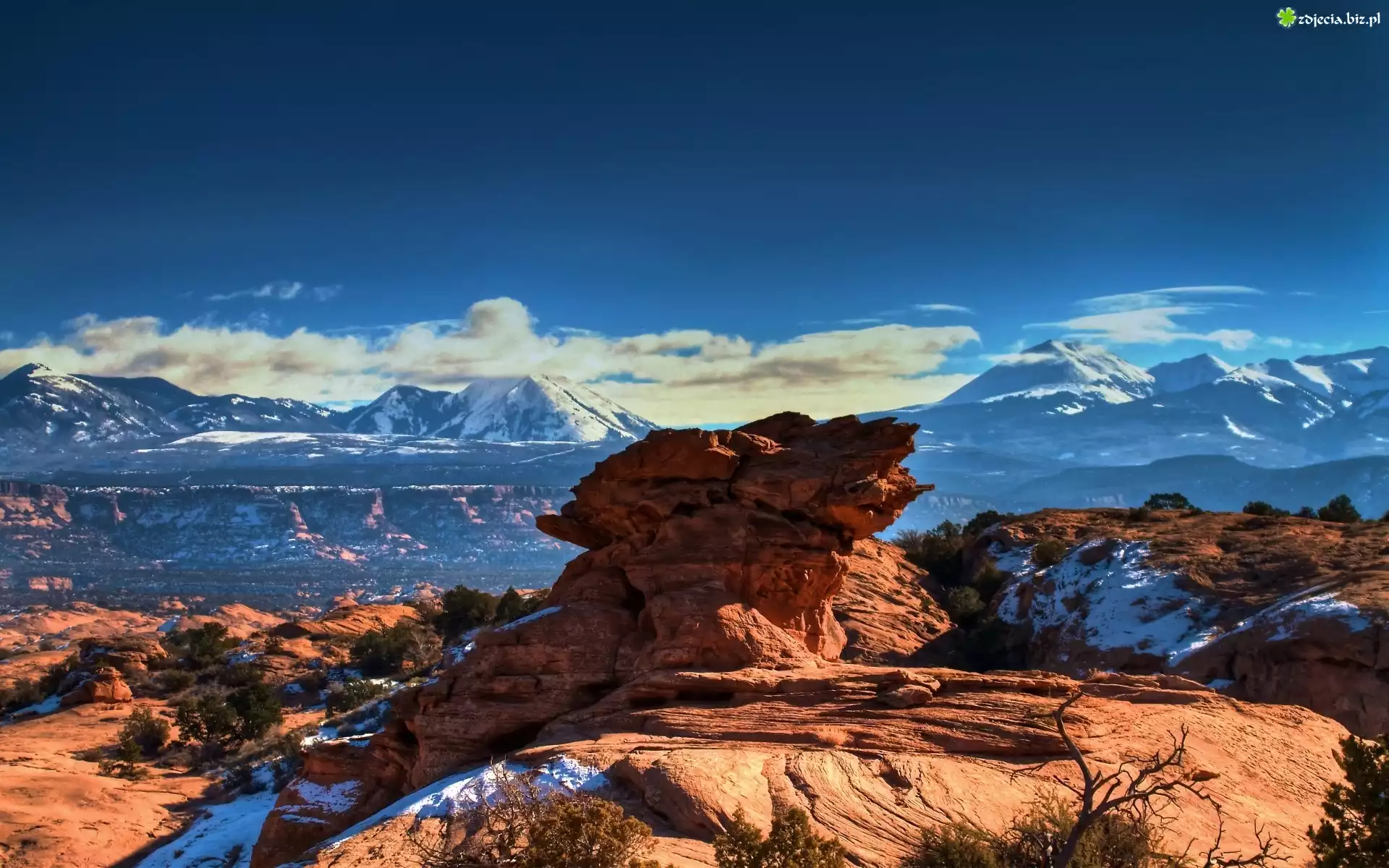 Stany Zjednoczone, Stan Utah, Park Narodowy Canyonlands, Kanion, Świt Azja, Góry Góry, Kanion, Rzeka, Świt Kaniony, Chmury, Niebo Kaniony, Łąka, Kwiaty Góra Kanion Zachód, Słońca, Kanion, Kaktusy Góra, łąki, Niebo Kanion, Skały, Drzewa Kanion, Rośliny Góra, Łoś Góry, Kanion Wrota, Niebios
