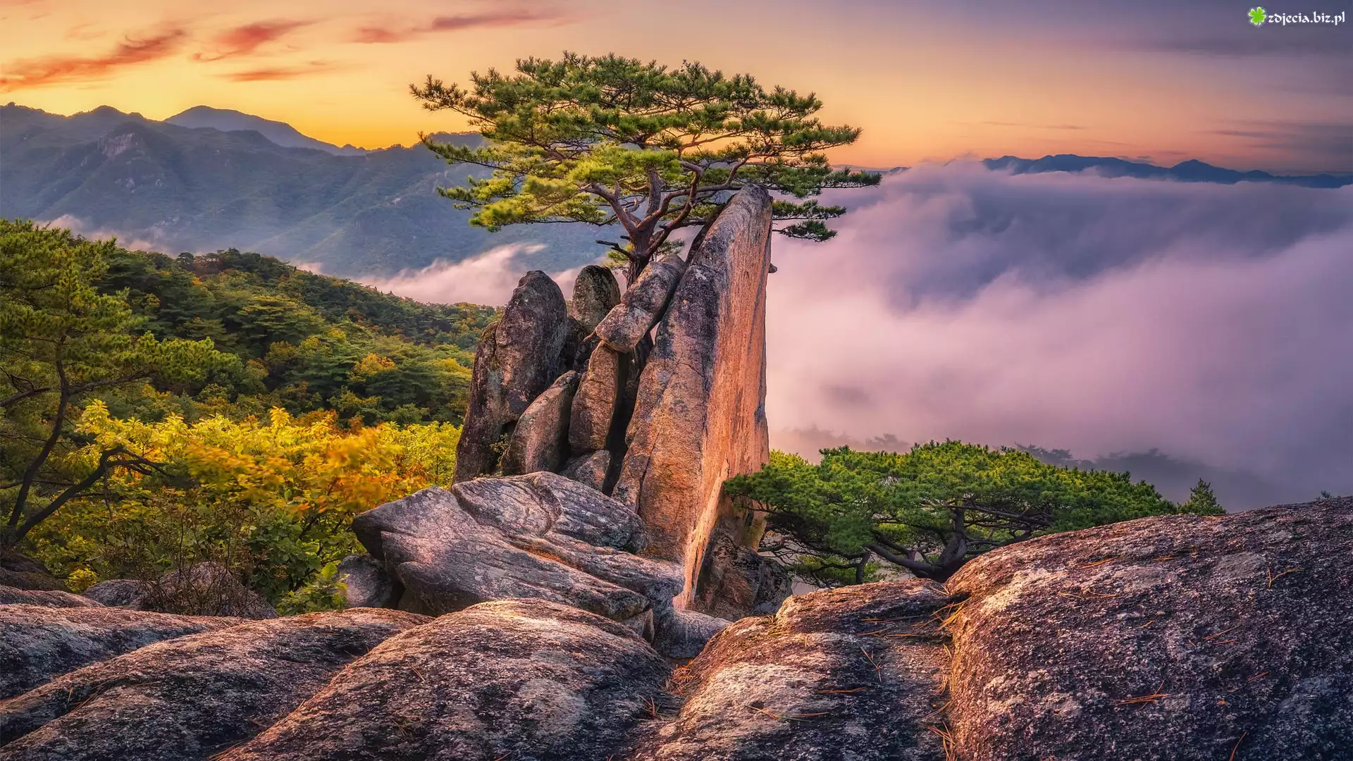 Zdjęcie Wschód słońca, Góry, Skały, Drzewa, Sosna, Mgła