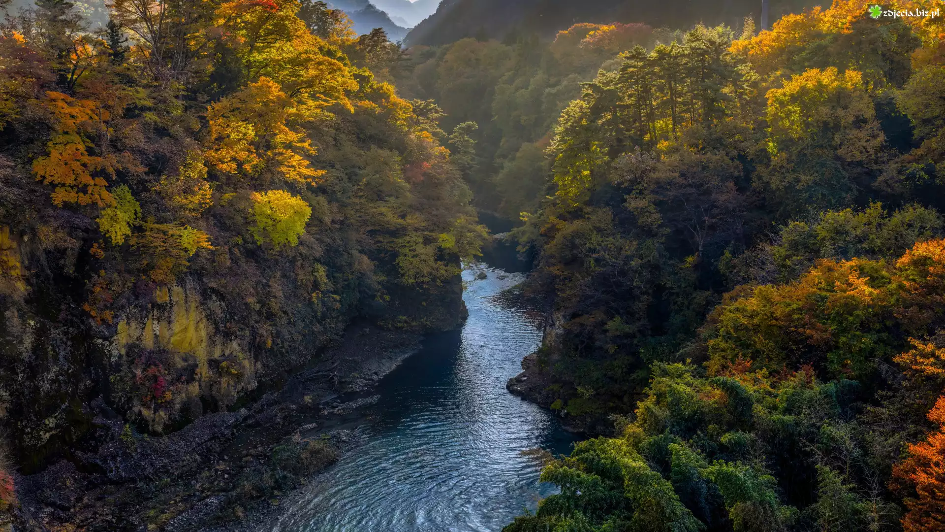 Zdjęcie Las, Drzewa, Rzeka, Skały, Góry, Jesień
