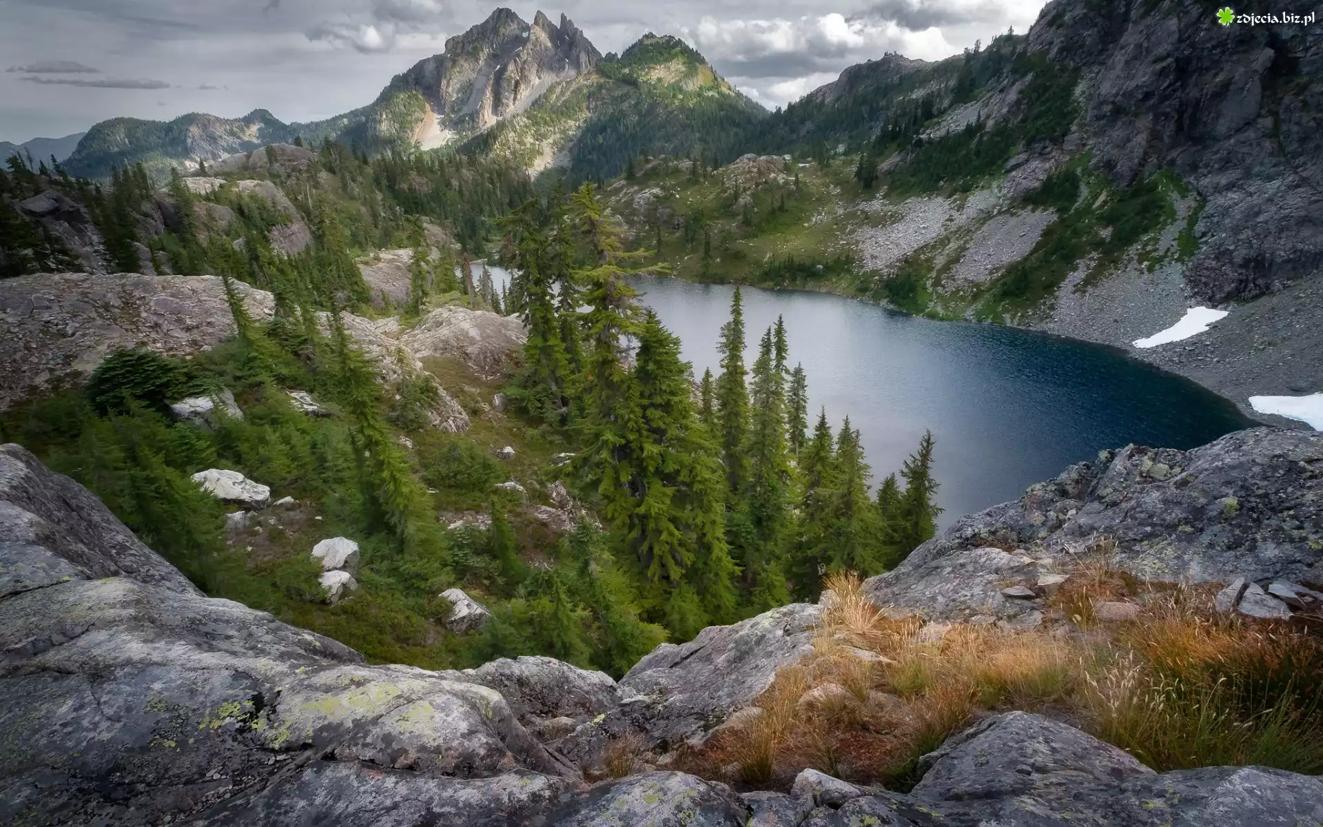 Zdjęcie Góry, Skały, Jezioro, Drzewa, Chmury