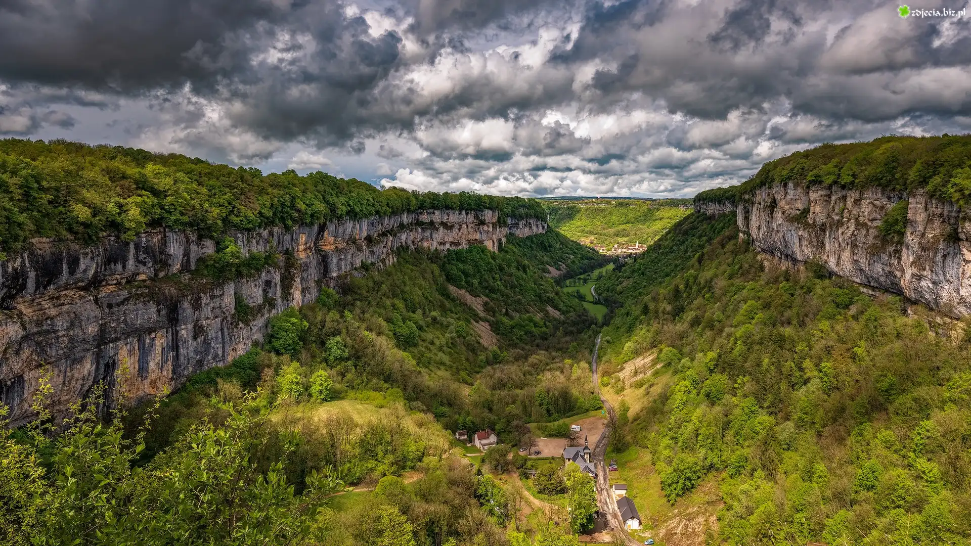 Zdjęcie Skały, Dolina, Góry Jura, Droga, Domy, Drzewa, Rośliny, Gmina Baume les Messieurs, Francja