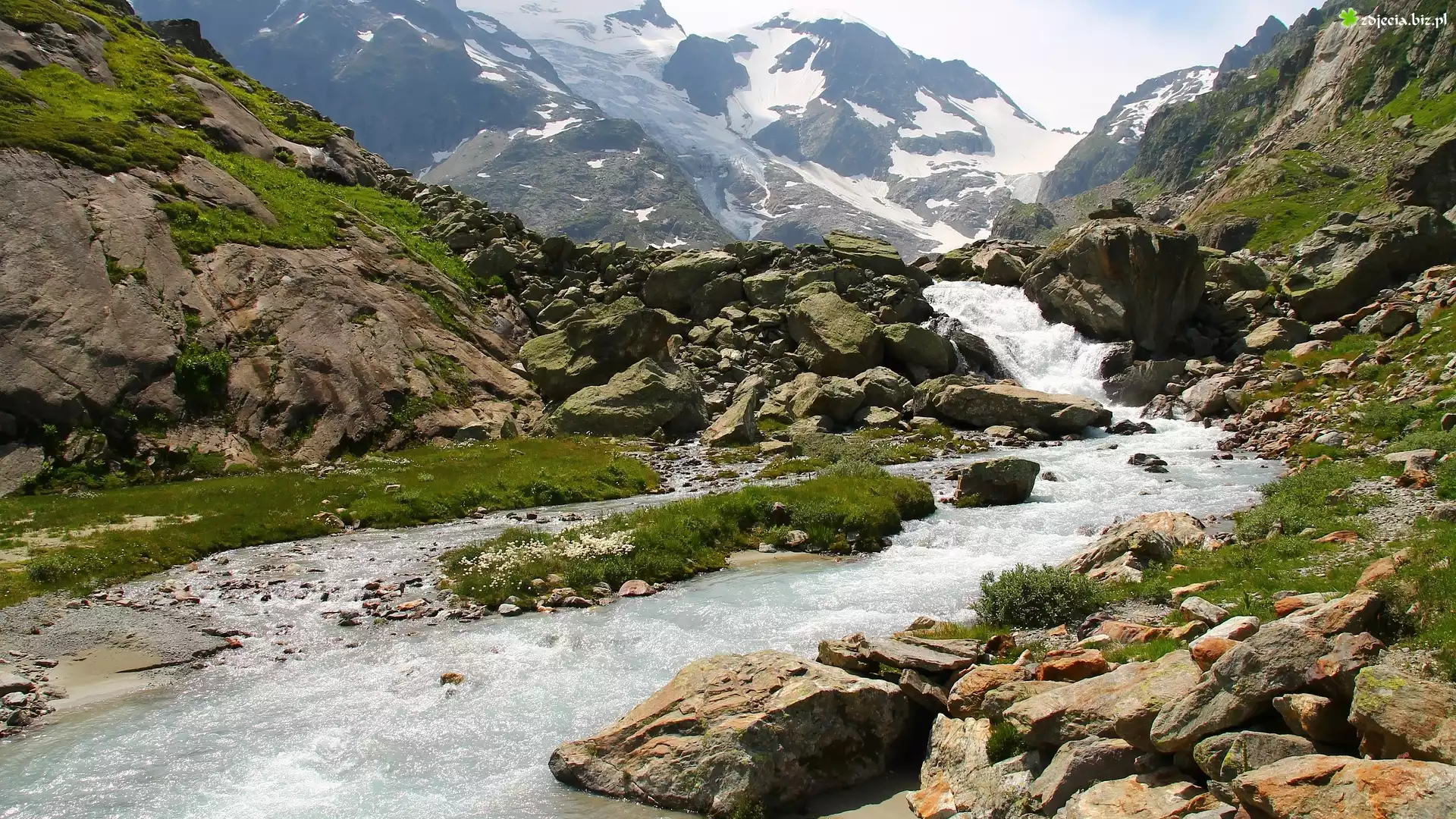 Zdjęcie Góry, Alpy, Skały, Rzeka Meienreuss, Skały, Roślinność, Susten, Kanton Wallis, Szwajcaria