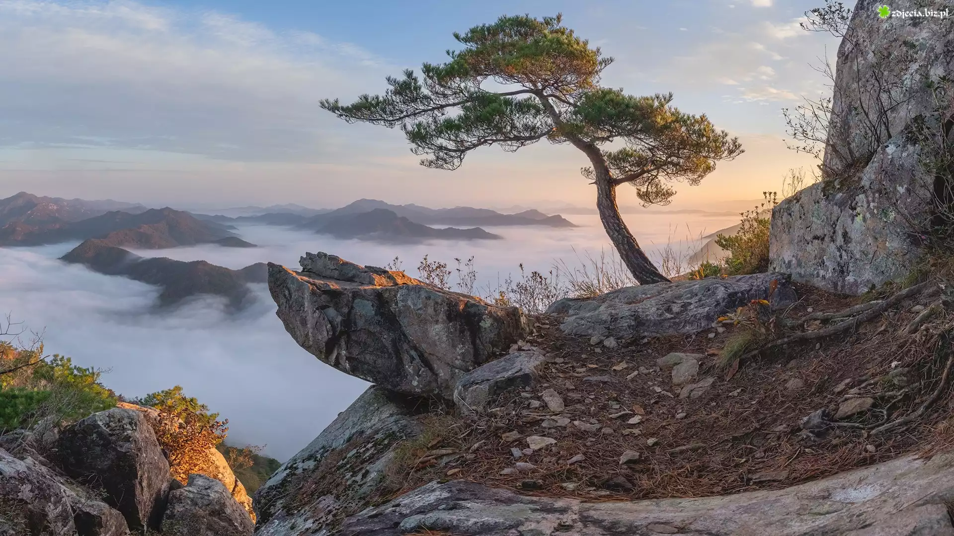 Zdjęcie Góry, Skały, Mgła, Sosna, Pochylona