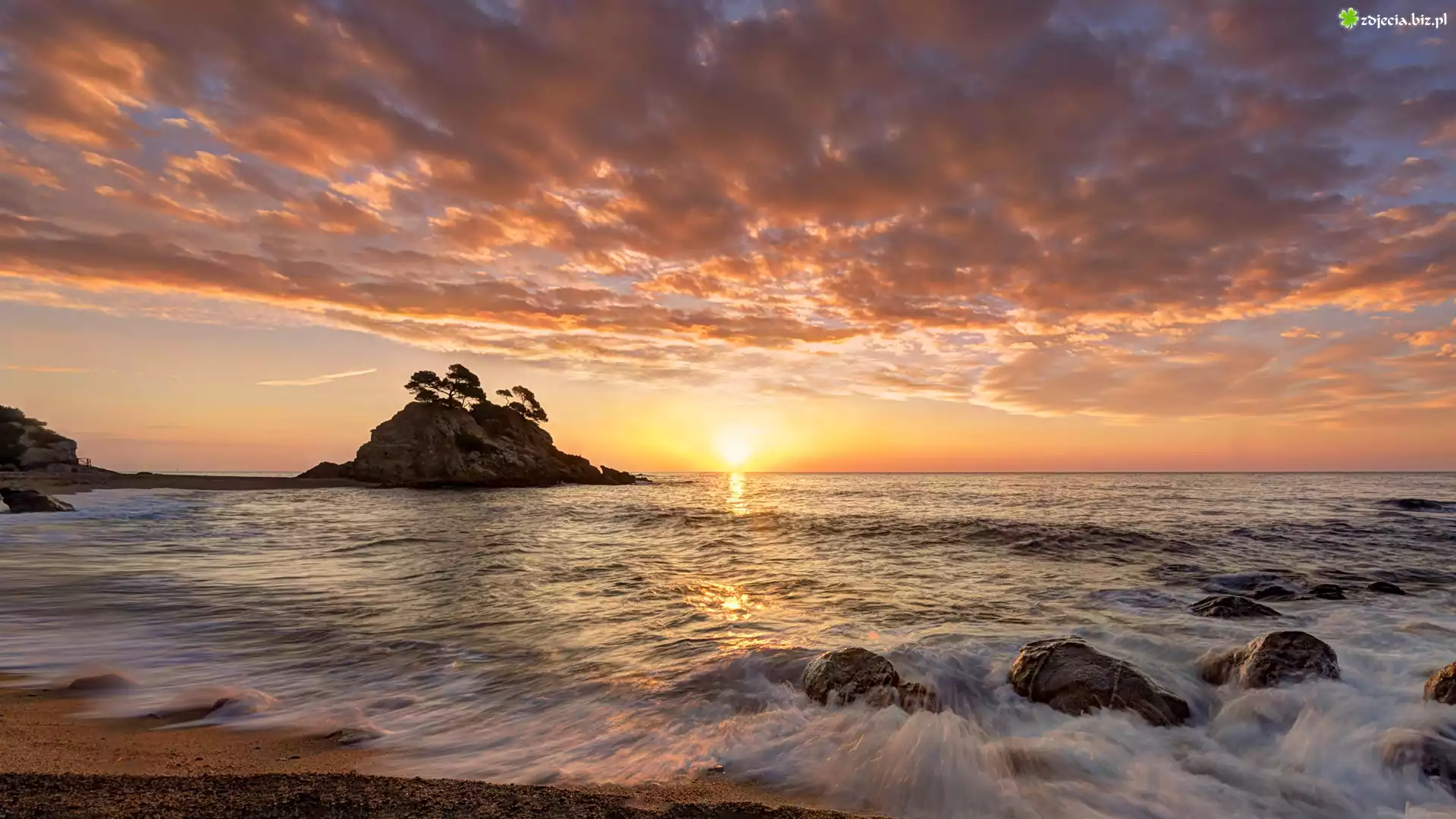 Zdjęcie Morze, Skały, Brzeg, Fale, Wschód słońca, Chmury