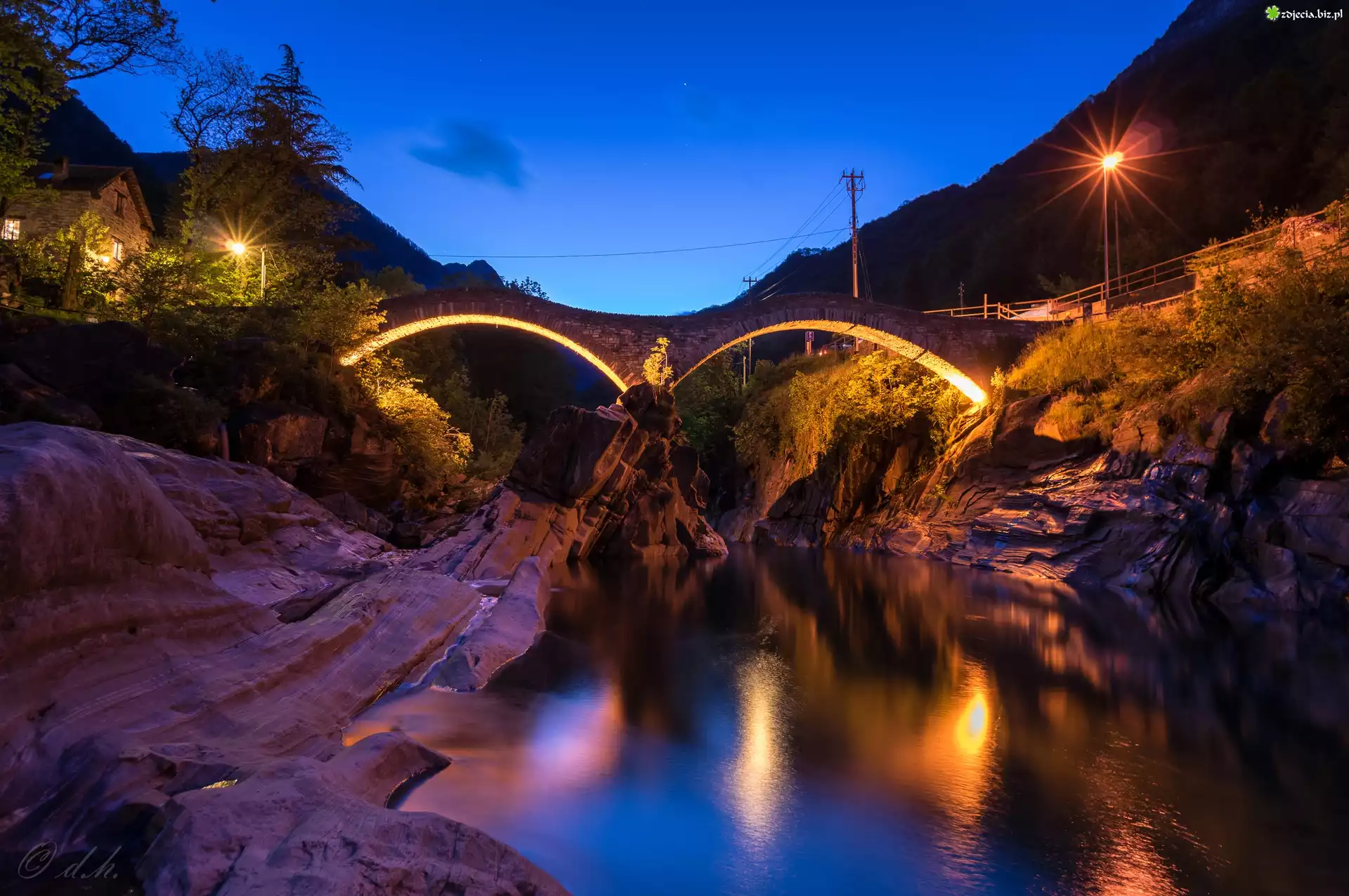 Zdjęcie Skały, Rzeka, Lampy, Most, Roślinność