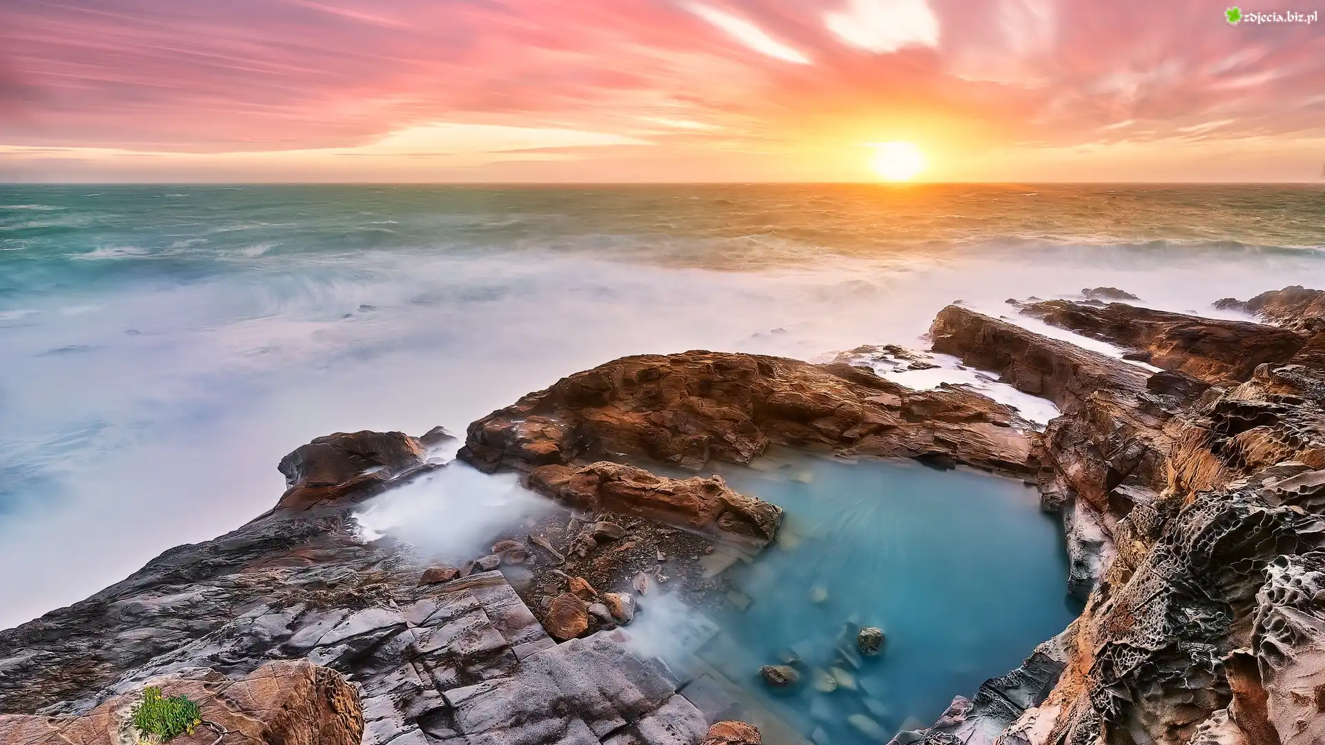 Zdjęcie Morze, Zachód słońca, Skały, Kolorowe, Niebo
