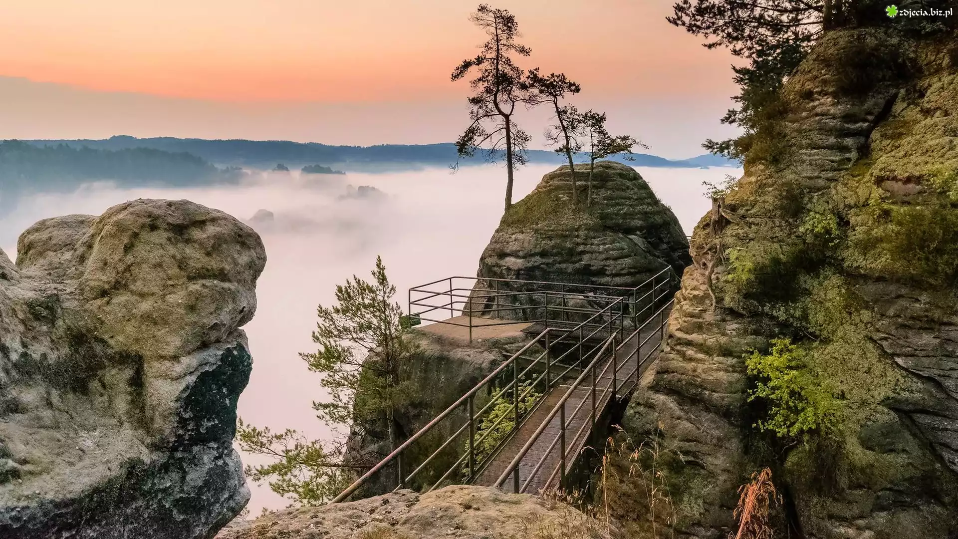 Zdjęcie Góry Połabskie, Skały, Mgła, Pomost, Drzewa, Park Narodowy Saskiej Szwajcarii, Niemcy