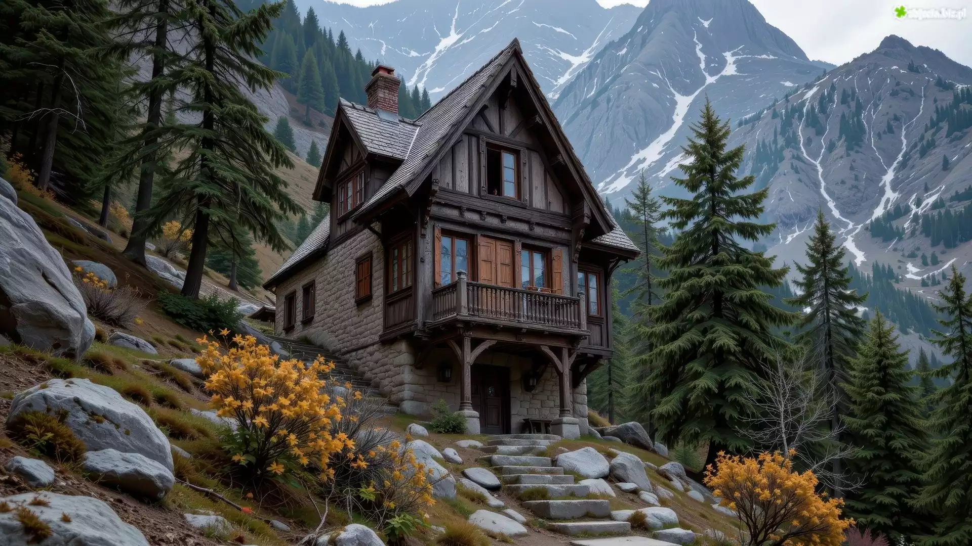 Zdjęcie Góry, Dom, Schody, Skały, Drzewa, Grafika AI