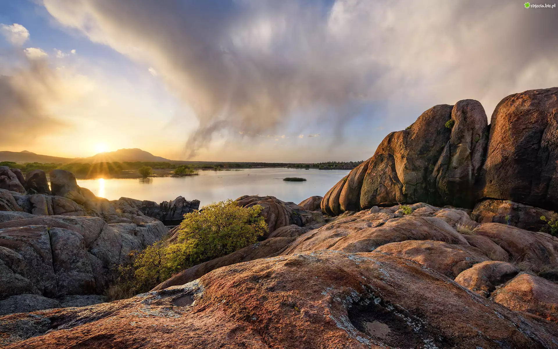 Zdjęcie Skały, Jezioro, Wschód słońca, Drzewa