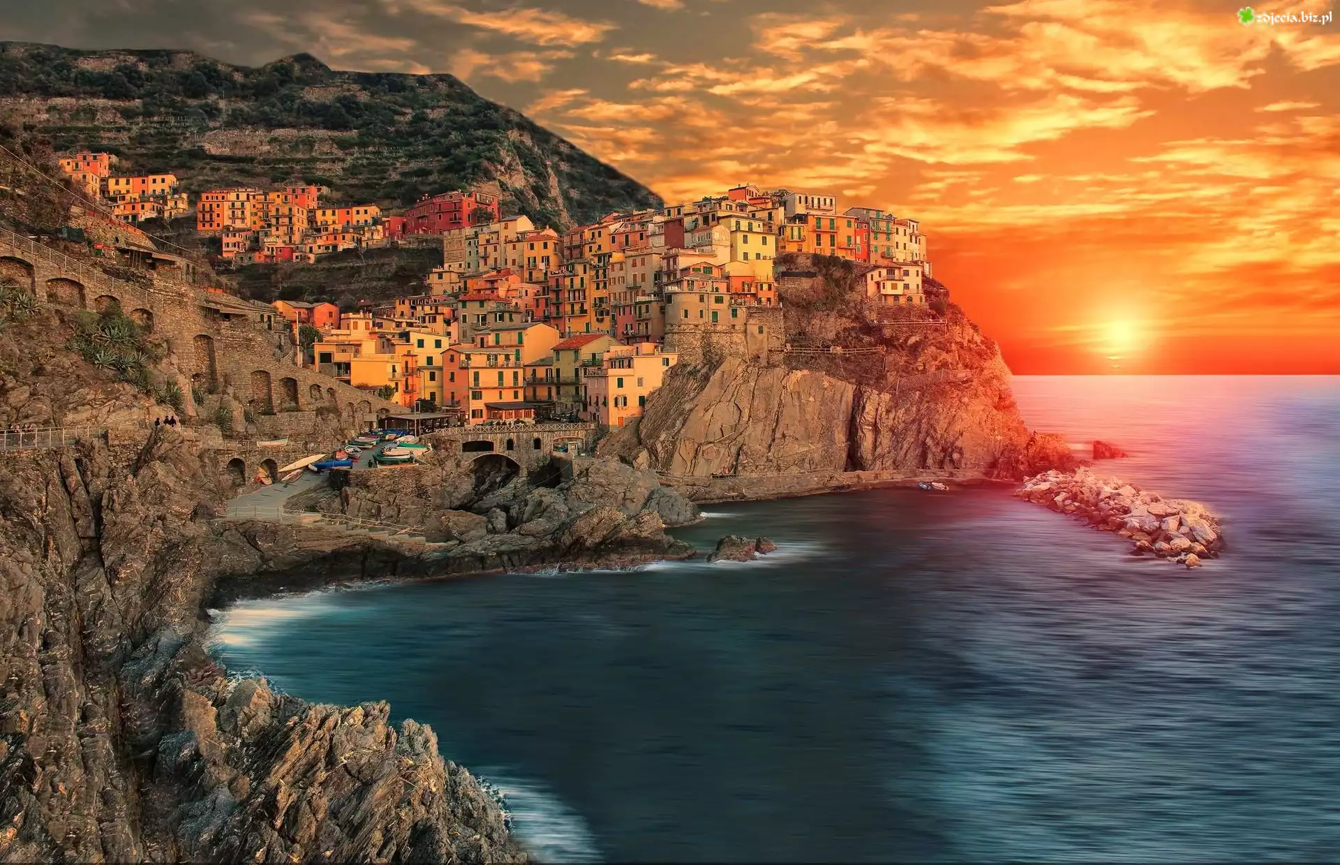 Zdjęcie Skały, Morze, Zachód, Słońca, Domy