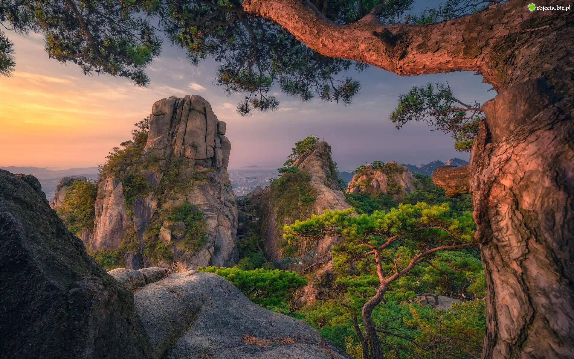 Zdjęcie, Wschód słońca, Góry, Skały, Drzewa, Sosny