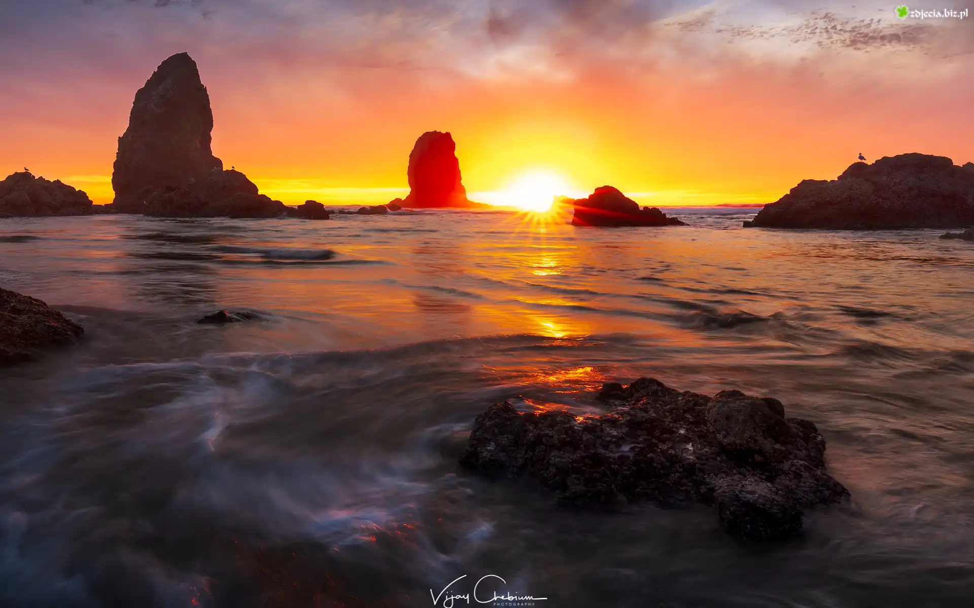 Zdjęcie Skały, Morze, Ocean Spokojny, Zachód słońca, Miejscowość Cannon Beach, Stan Oregon, Stany Zjednoczone |