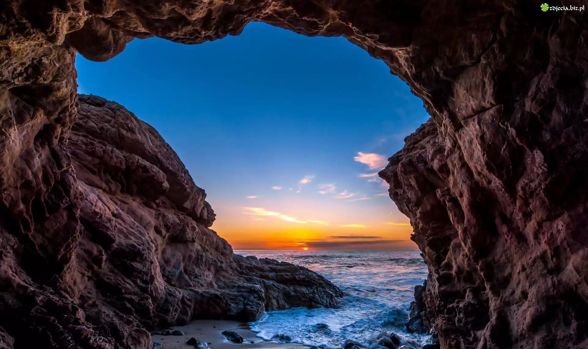Zdjęcie Jaskinia, Skały, Wybrzeże, Oceanu, Zachód, Słońca, Malibu, USA