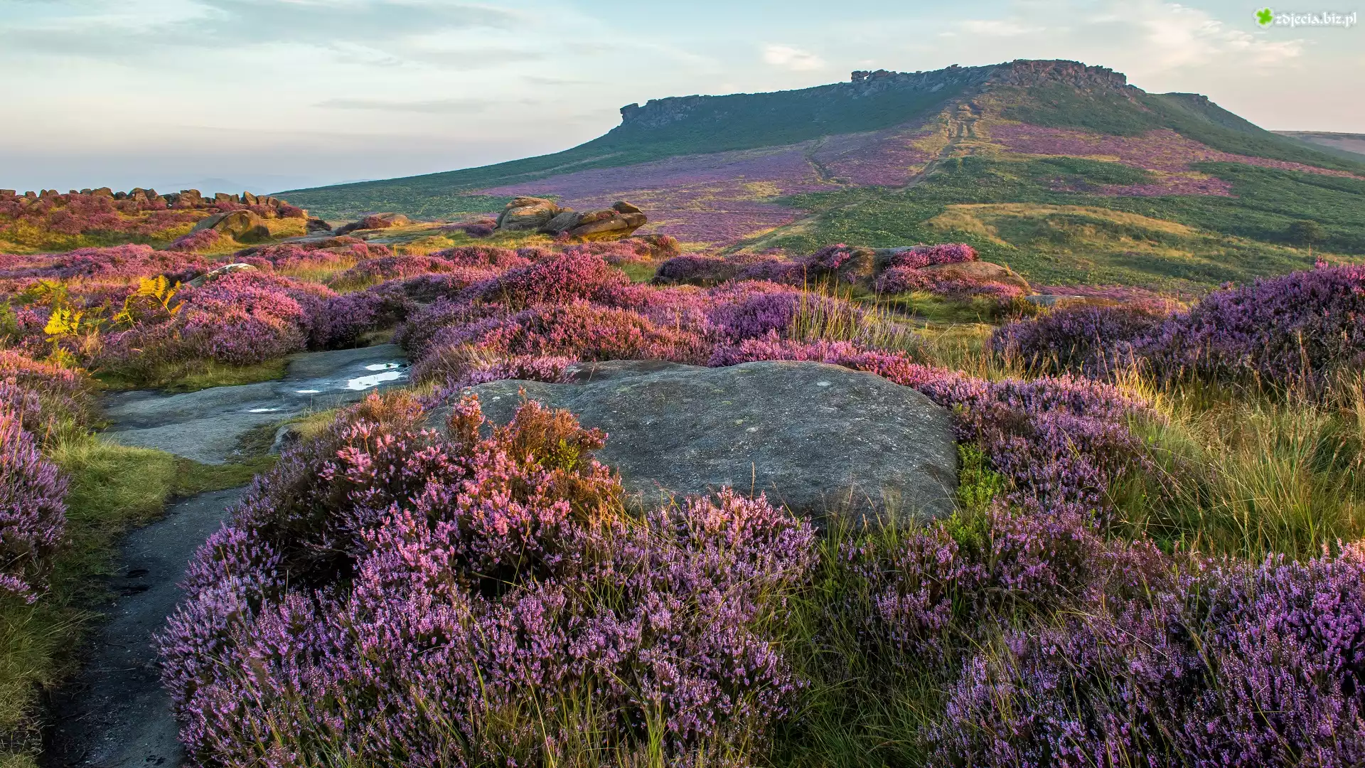 Zdjęcie Anglia, Park Narodowy Peak District, Wzgórza, Skały, Wrzosy, Wrzosowisko