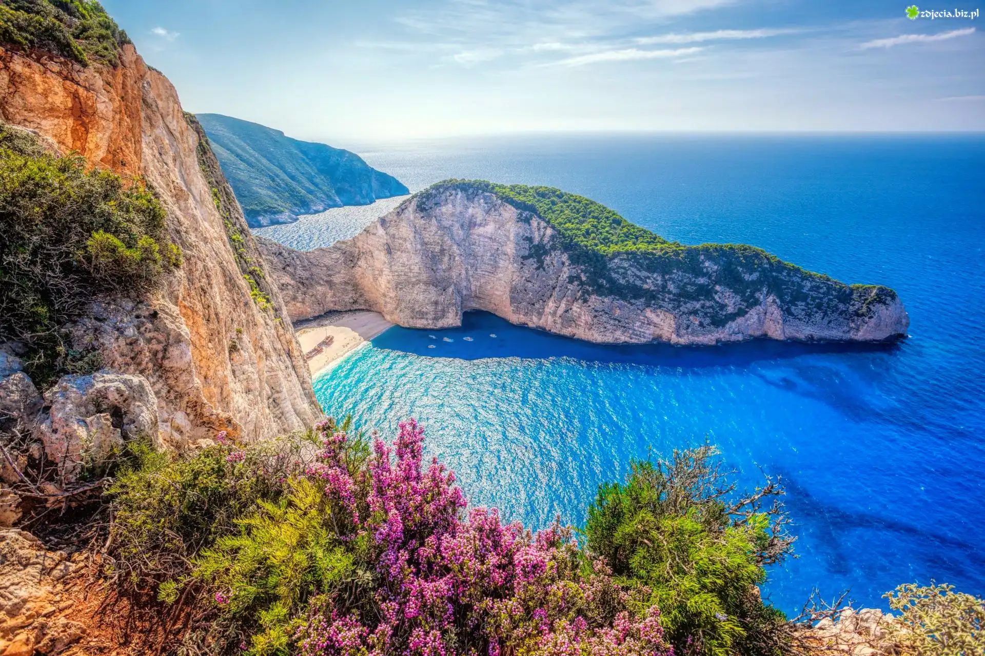 Zdjęcie, Grecja, Wyspa Zakintos, Plaża Nawajo, Morze Jońskie, Zatoka, Skały
