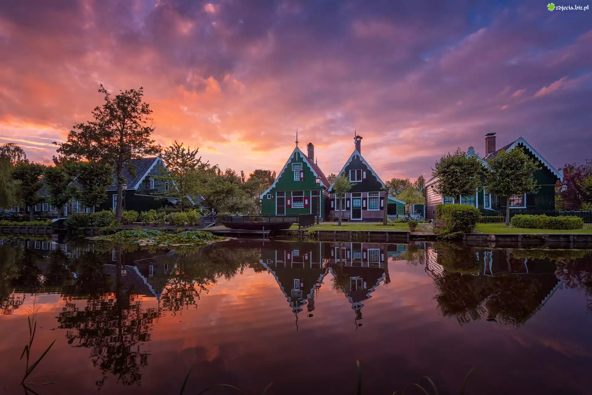 Zdjęcie, Holandia, Skansen Zaanse Schans, Domy, Kanał, Świt, Odbicie