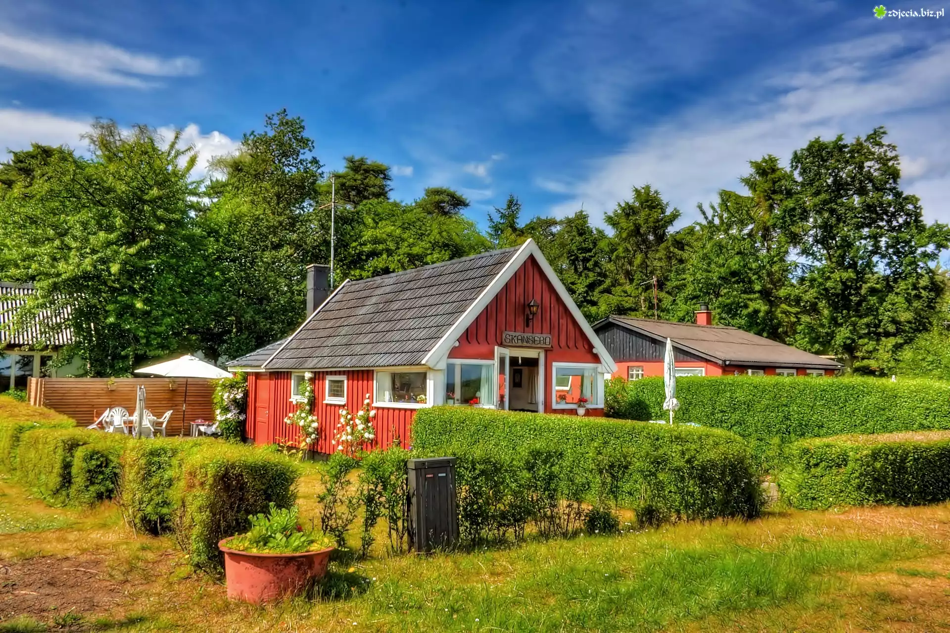 Zdjęcie Wieś, Skansen, Ogródki, Drzewa, Obłoki, Przebijające, Światło